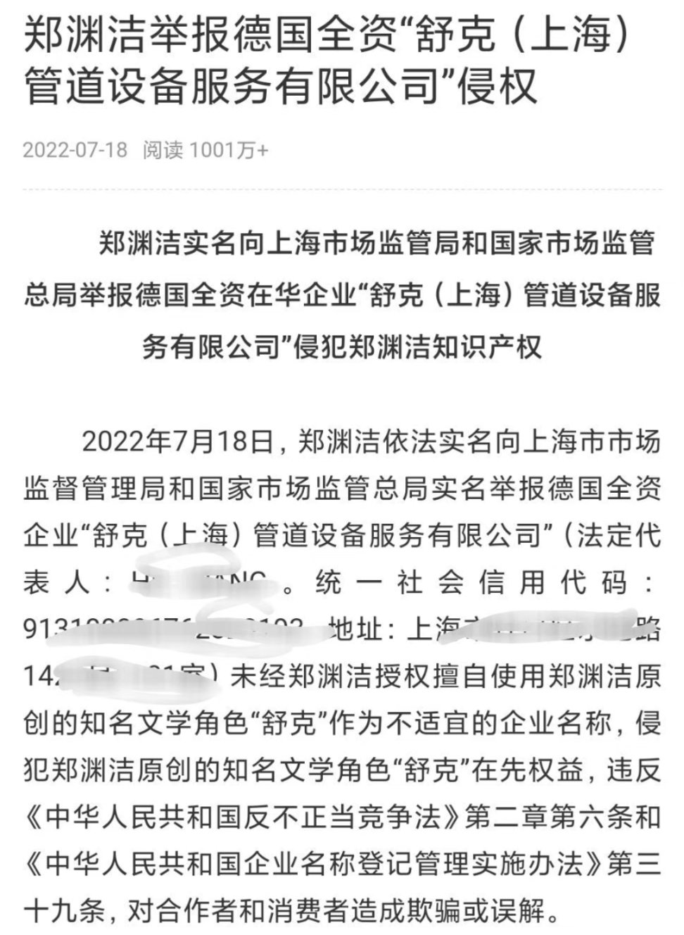 童话大王谈及的侵犯他商标的企业,有一家居然是“舒克管道设备...公司。童话大王的文艺作品再怎么说也跟管道公司不沾边吧?而且管道公司还是1972年成立的,《舒克和贝塔》则是在1989年才出版。