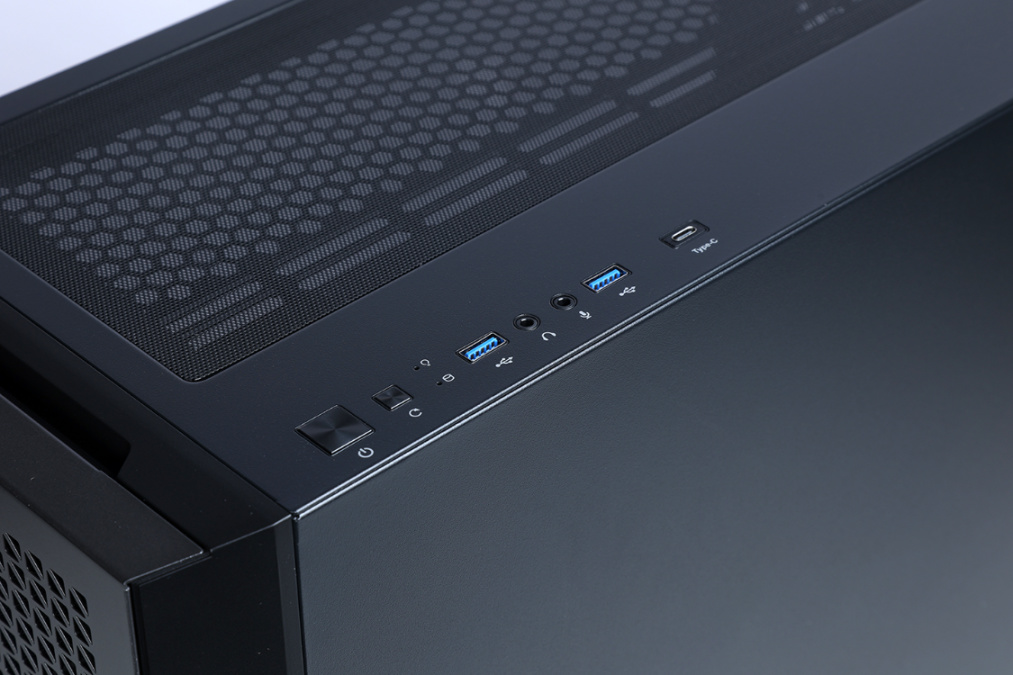 机箱I/O面板位于机箱顶部一侧,除了常规的开关/重启键、音频接口外,还有两个USB 3.0接口和一个Type-C 3.2 Gen 2数据接口,支持PD快速充电、DP高清视频输出并最高可达到10Gbps的传输速度;