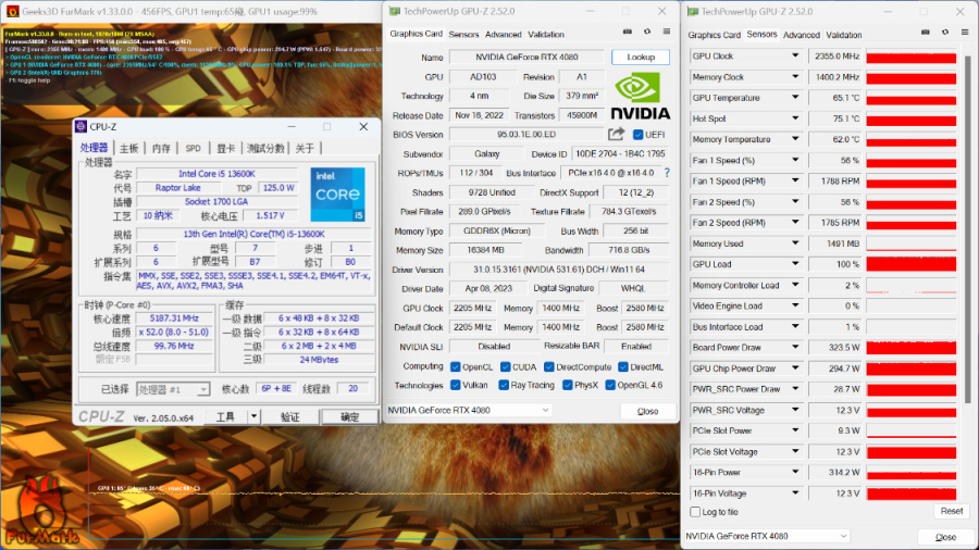 FurMark烤机测试,烤机20min,显卡温度为65°左右,显卡功耗为330W左右;