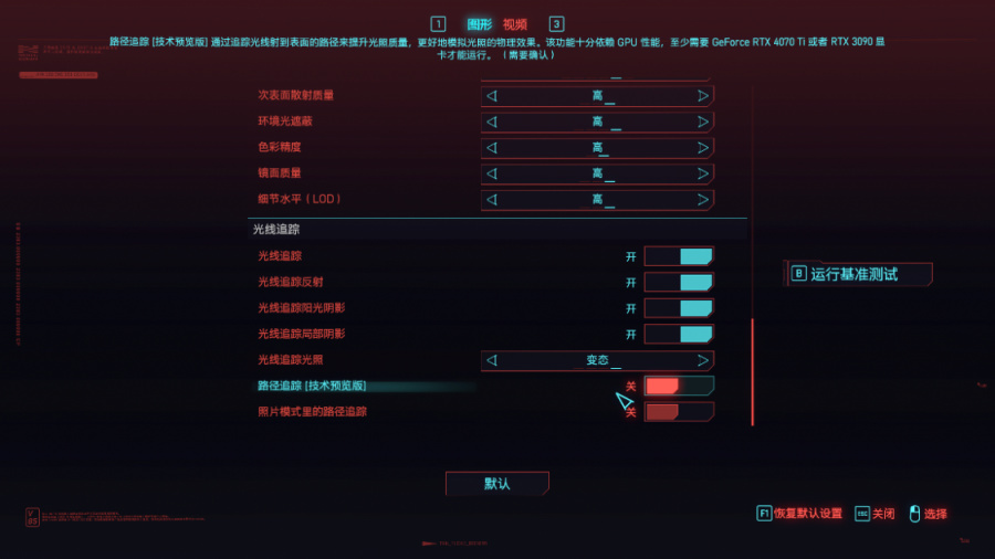 在保持画质、分辨率不变时,将光追开启“路径追踪[技术预览版]”设置后,再次测试;