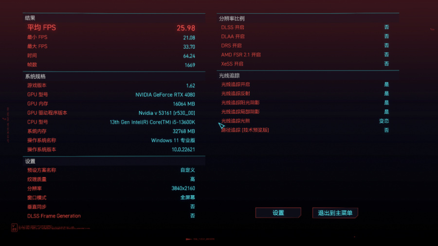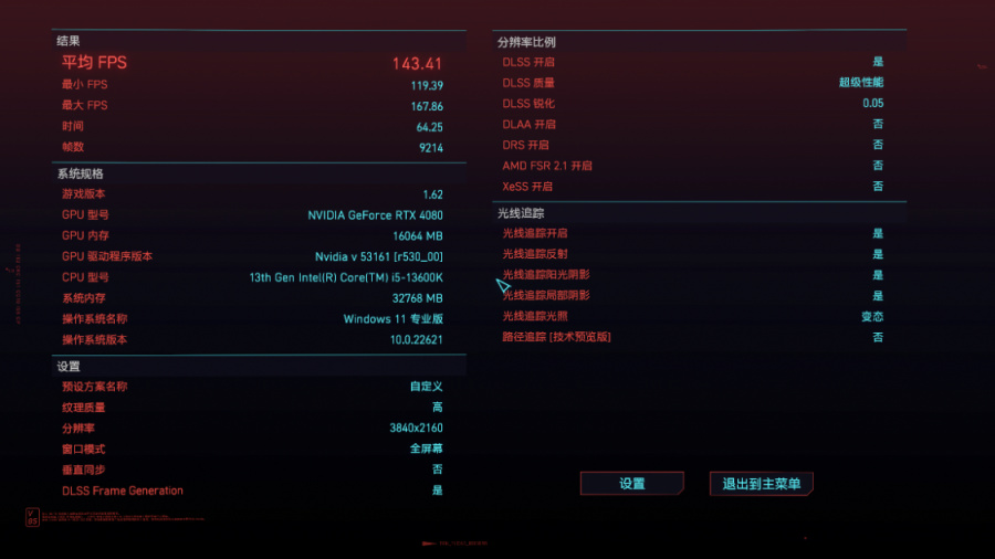 《赛博朋克2077》基准测试,画质超级、光追变态、4K分辨率下,关闭DLSS时,游戏的实际帧率约为25.98FPS左右。开启超级性能模式下的DLSS 2.0后,游戏实际帧率约为110.76PS左右。继续开启DLSS 3.0后,游戏实际帧率约为143.41FPS左右;