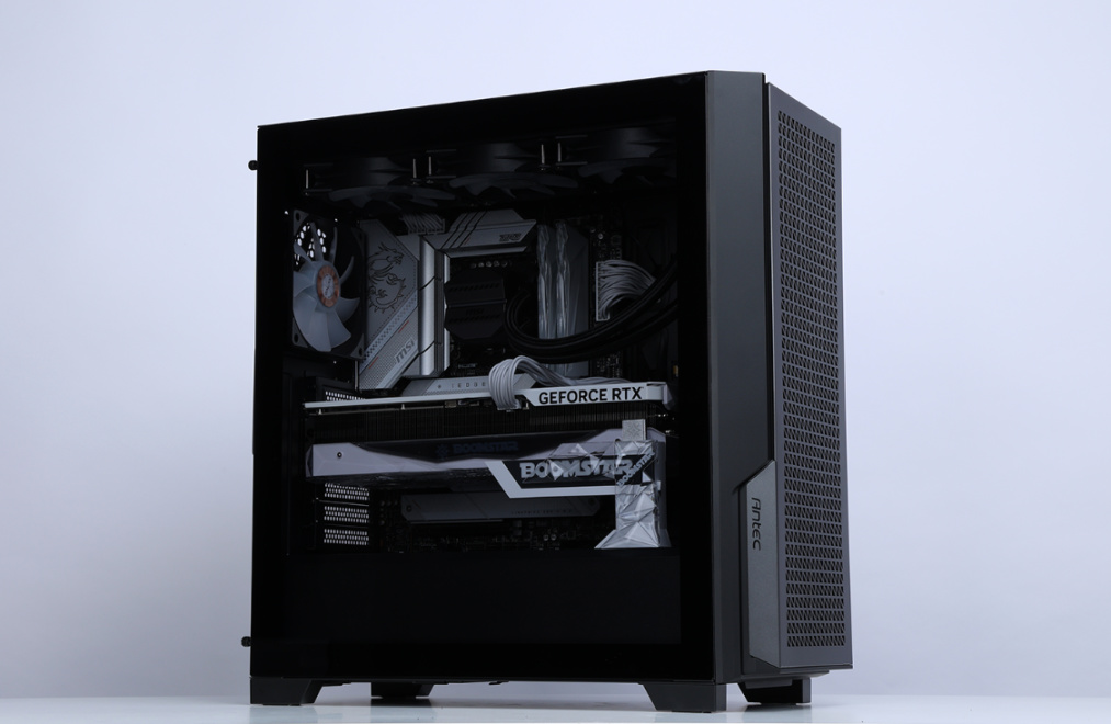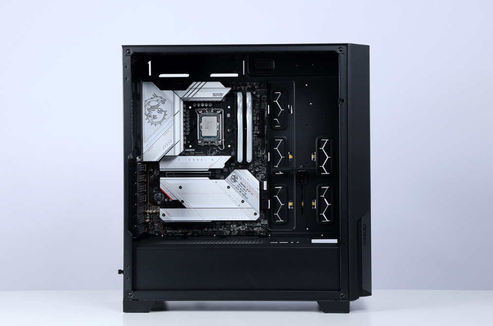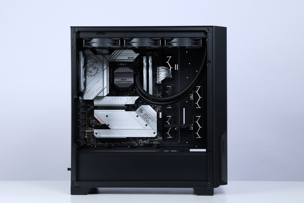 这个段位的装机,机箱太省肯定没必要,颜值、性能同样也得拉满,但也绝不浪费。最终选定的是这款机电大厂安钛克新近发布的机箱P20C。同系列还有ARGB版本和非侧透设计主打降噪静音的P20CE机箱。机箱三围469x220x490mm,中塔规格,主流钢化玻璃侧透设计,主体采用SPCC钢板材质,分量十足。