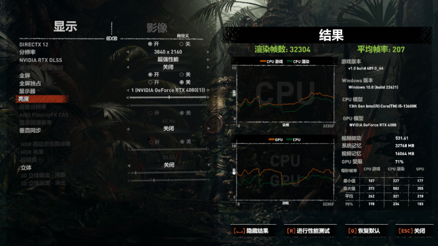 《古墓丽影·暗影》,画质最高,光追超高,DLSS超强性能,4K分辨率下,游戏平均帧率为207FPS;