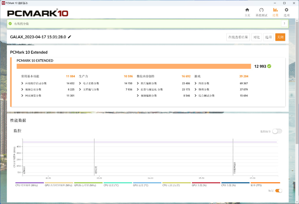 PC Mark Extended整机测试,整机得分12993分,常用基本功能得分11084分,生产力得分10596分,数为内容创作得分16692分,游戏得分38284分;