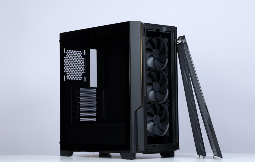 机箱前部标配三把支持PWM调速的12cm无光散热风扇;