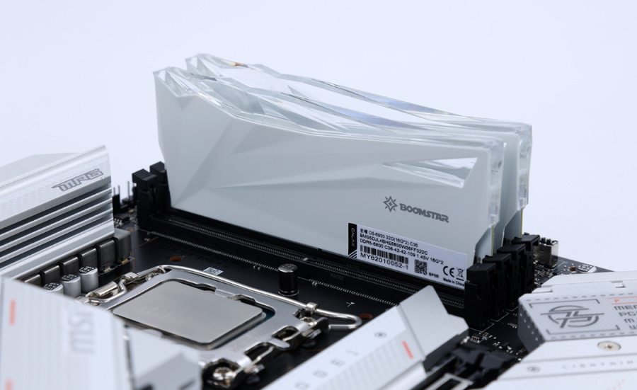 不论D4还是D5内存,4根插满这种事还是想想就好。主板配备4条DDR5内存插槽,支持OC 7200MHz的内存频率。咱直接选择的是星曜DDR5-6800MHz 16G*2内存,全白加持的高颜值,再加上时下顶流的海力士A-Die颗粒加持,肯定是你期待的高频D5内存。