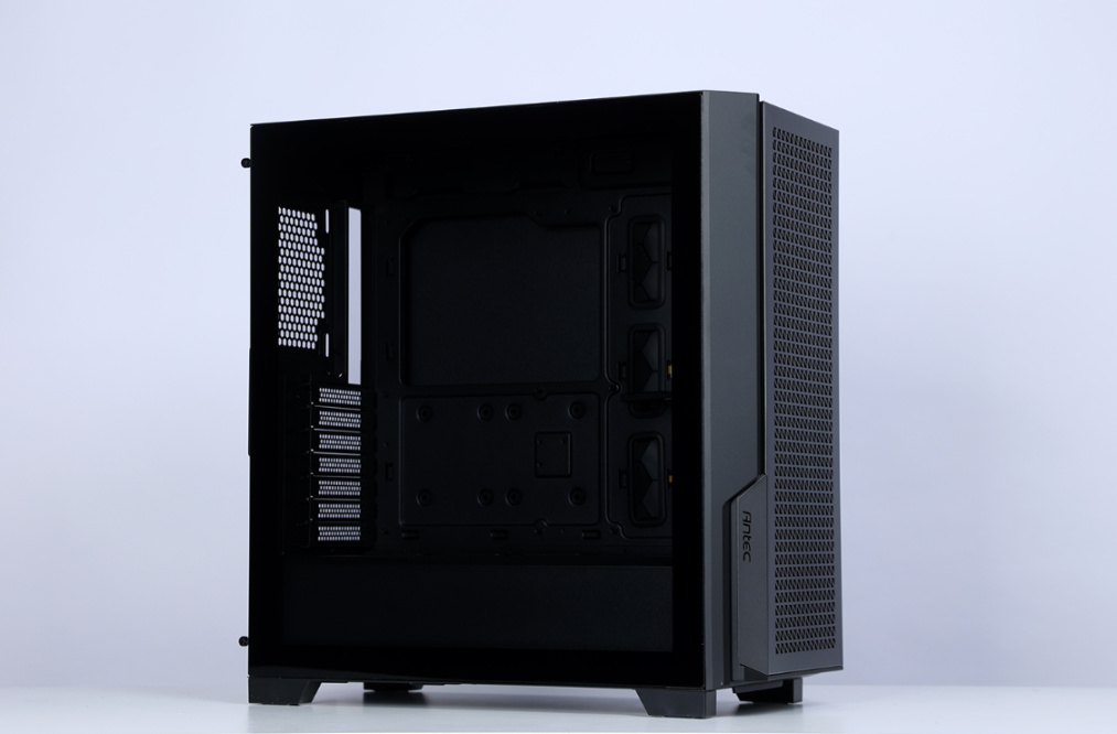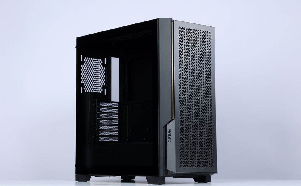 机箱前脸采用独特的金属开孔设计,搭配全尺寸防尘滤网,散热与防尘效果同时拉满,并支持免工具快拆。左侧下方有一个Antec品牌logo,金属网孔面板一侧还有一条黄色线条点缀,整体辨识度非常高。