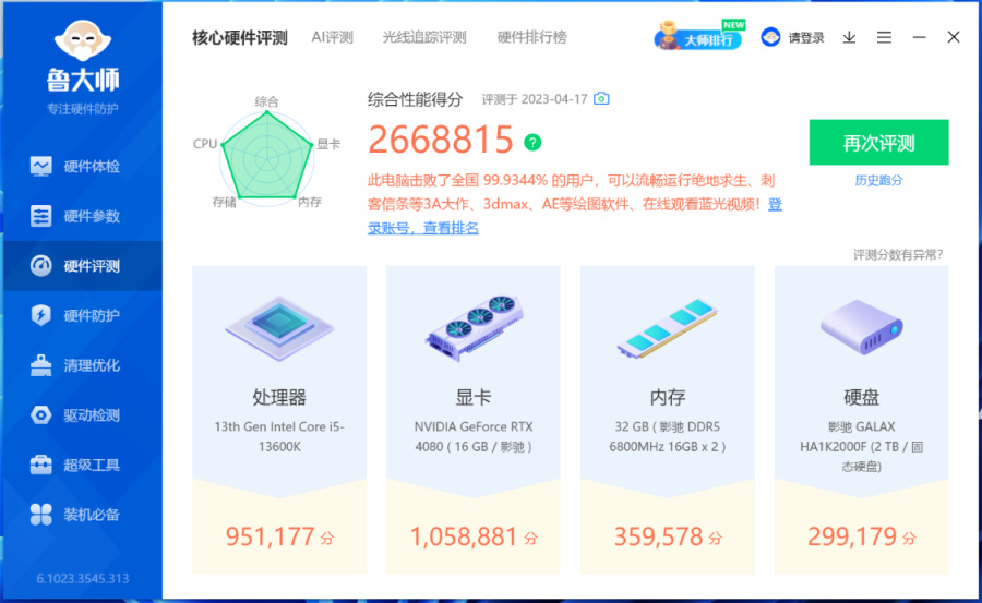 高达266W的整机跑分,可以击败全国99.93%的用户。