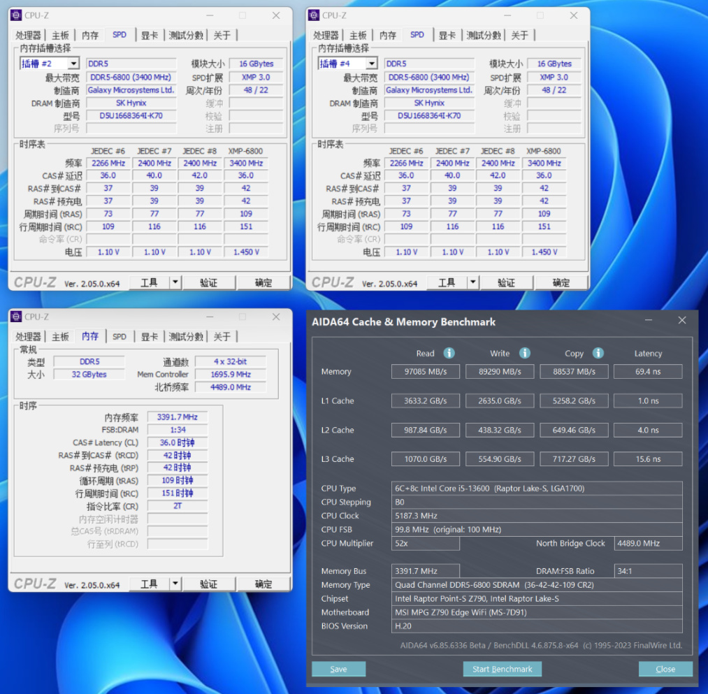 内存读写测试,直接开启XMP,内存读取速度为97085 MB/s,写入速度为89290 MB/s,复制速度为88537 MB/s,延时为69.4ns;如果你喜欢折腾,实测往上抄到7200MHz毫无压力。