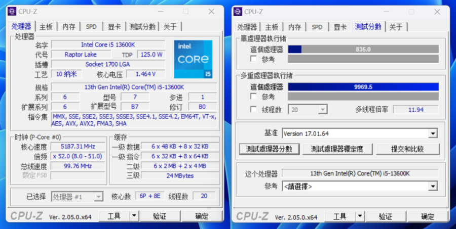CPU-Z基准测试,单核得分835分,多核得分9969.5分;