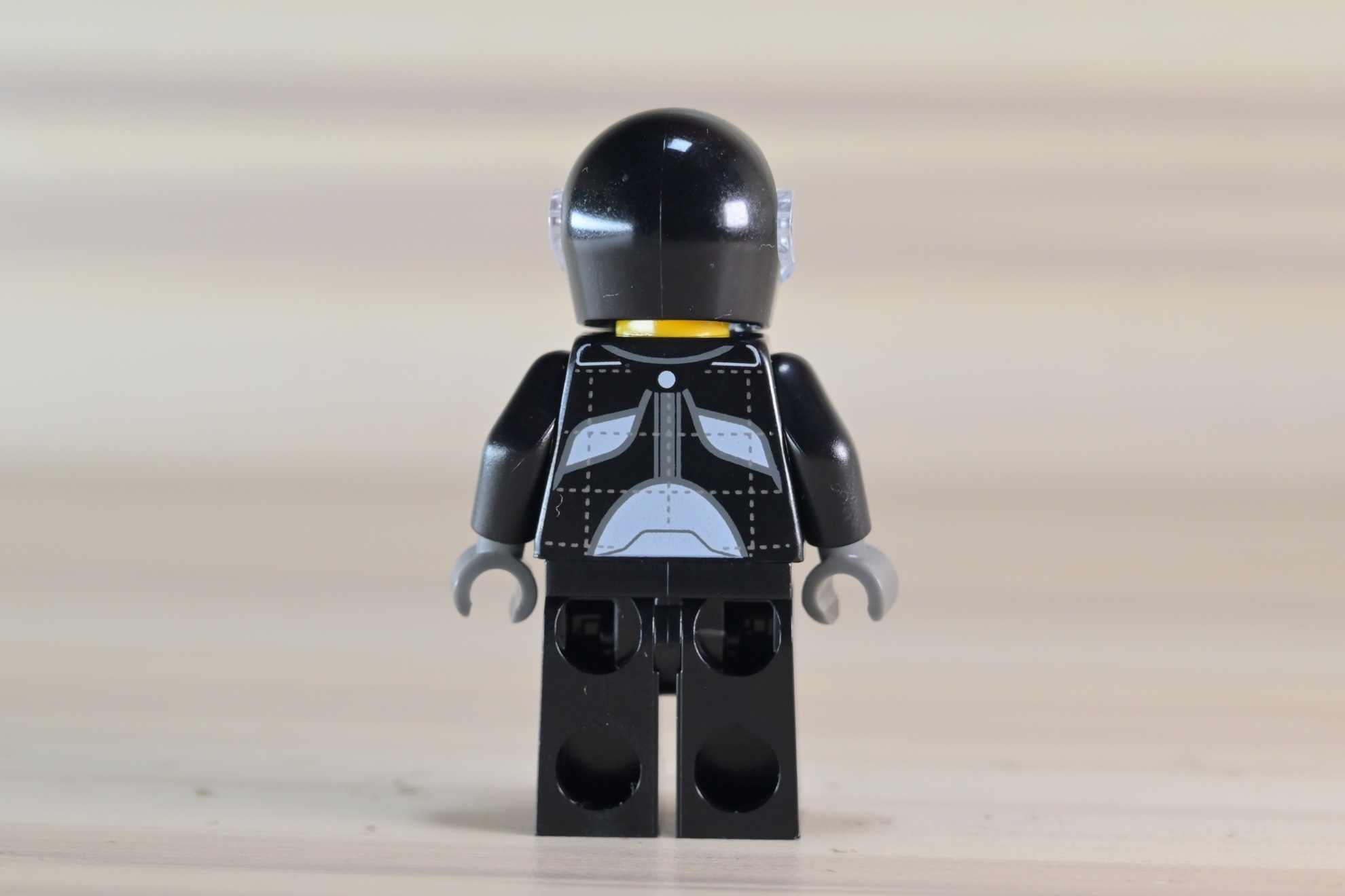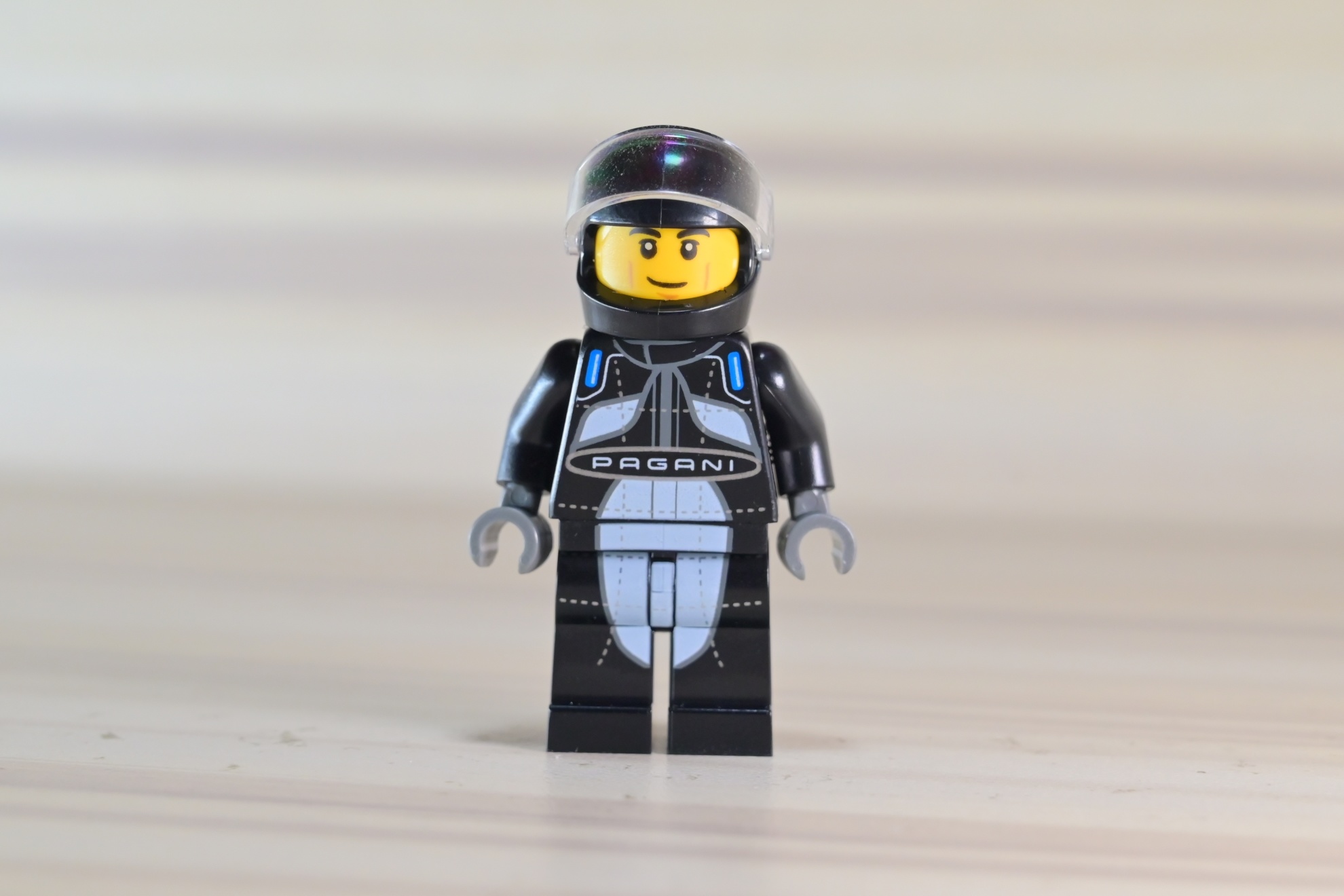 套内一个身穿蓝白黑三色赛车服的人仔,身上帕加尼的logo印刷的非常显眼。人仔正面全身印刷,赛车服缝线也看得清清楚楚。