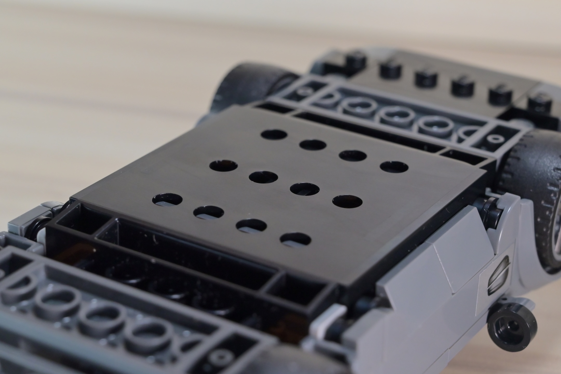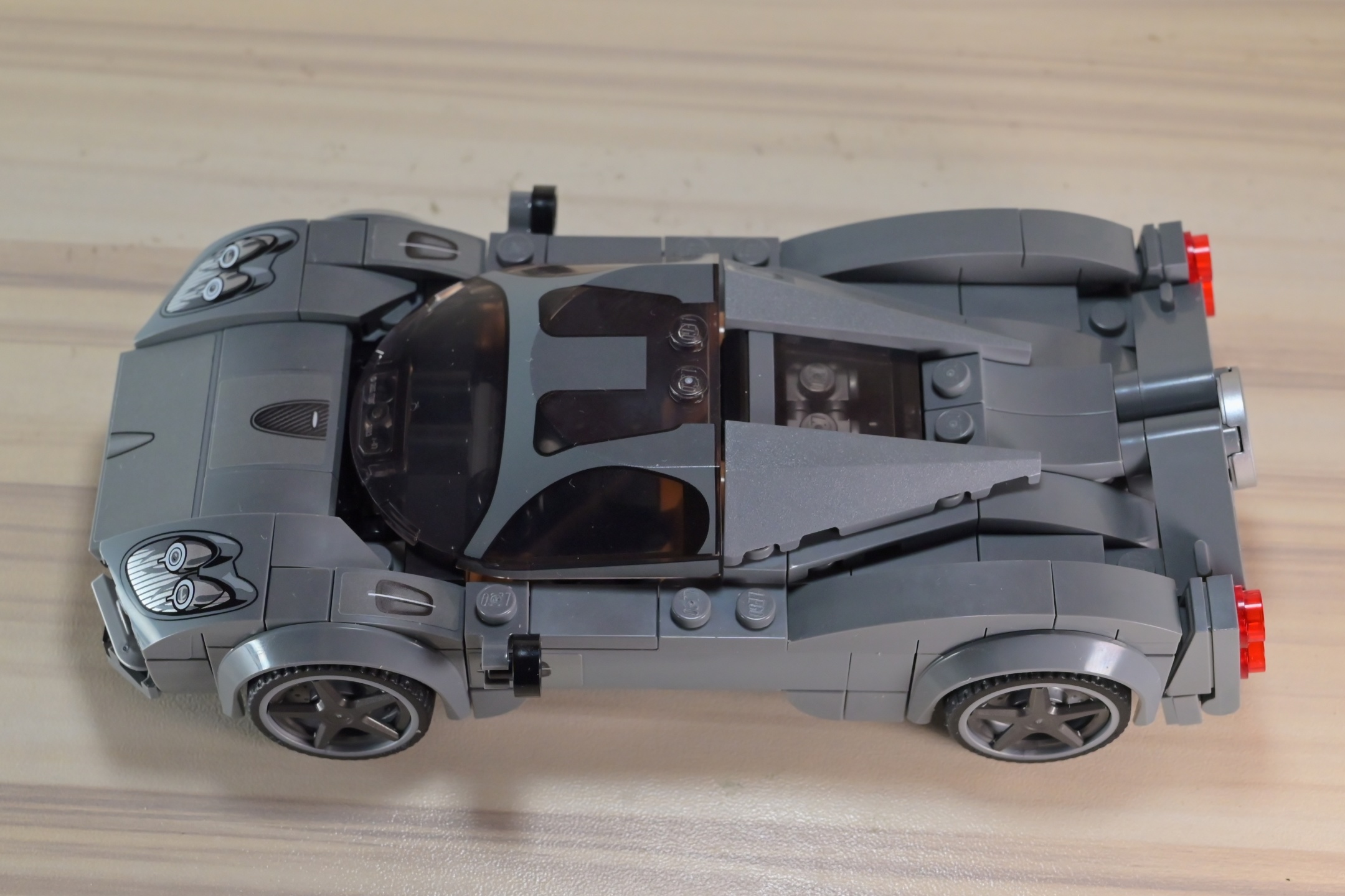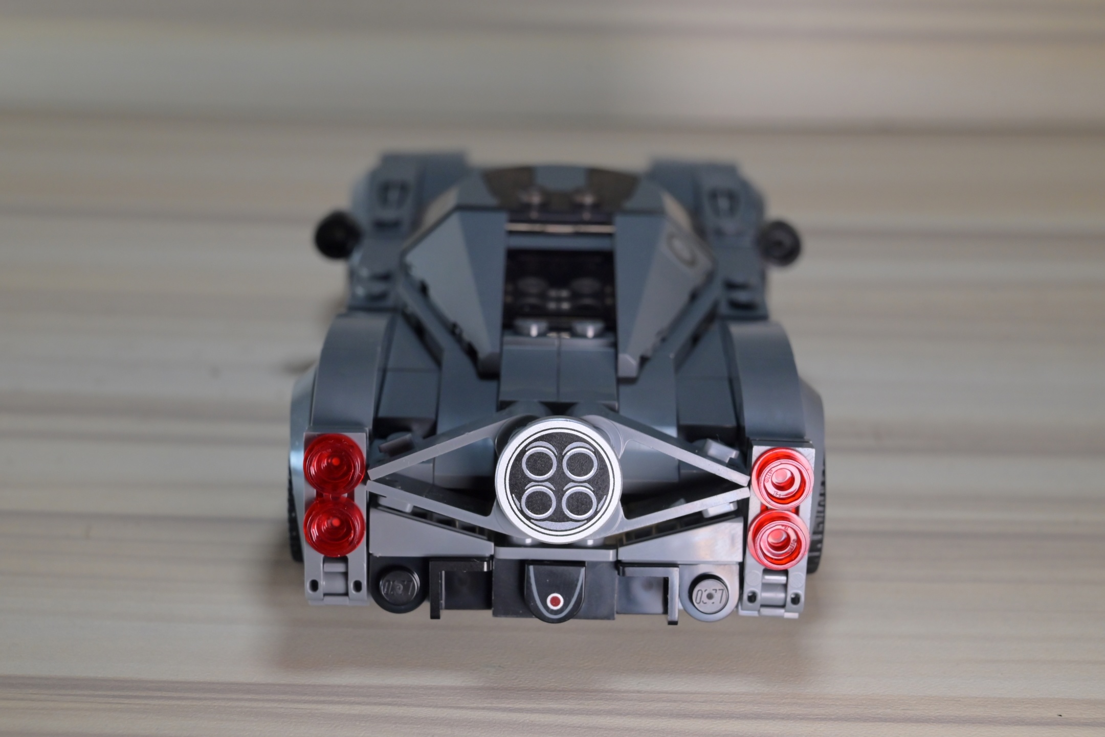 车尾部分是当时最吸引我的地方。使用snot技巧堆叠,用灰色奶酪零件来规范尾翼形状。整个车尾灯是使用连接件和灰色奶酪零件反向拼搭,车尾翼主要有四个门板零件组成,通过一个圆形印刷件来还原帕加尼标志性的四个中央钛合金排气管。
