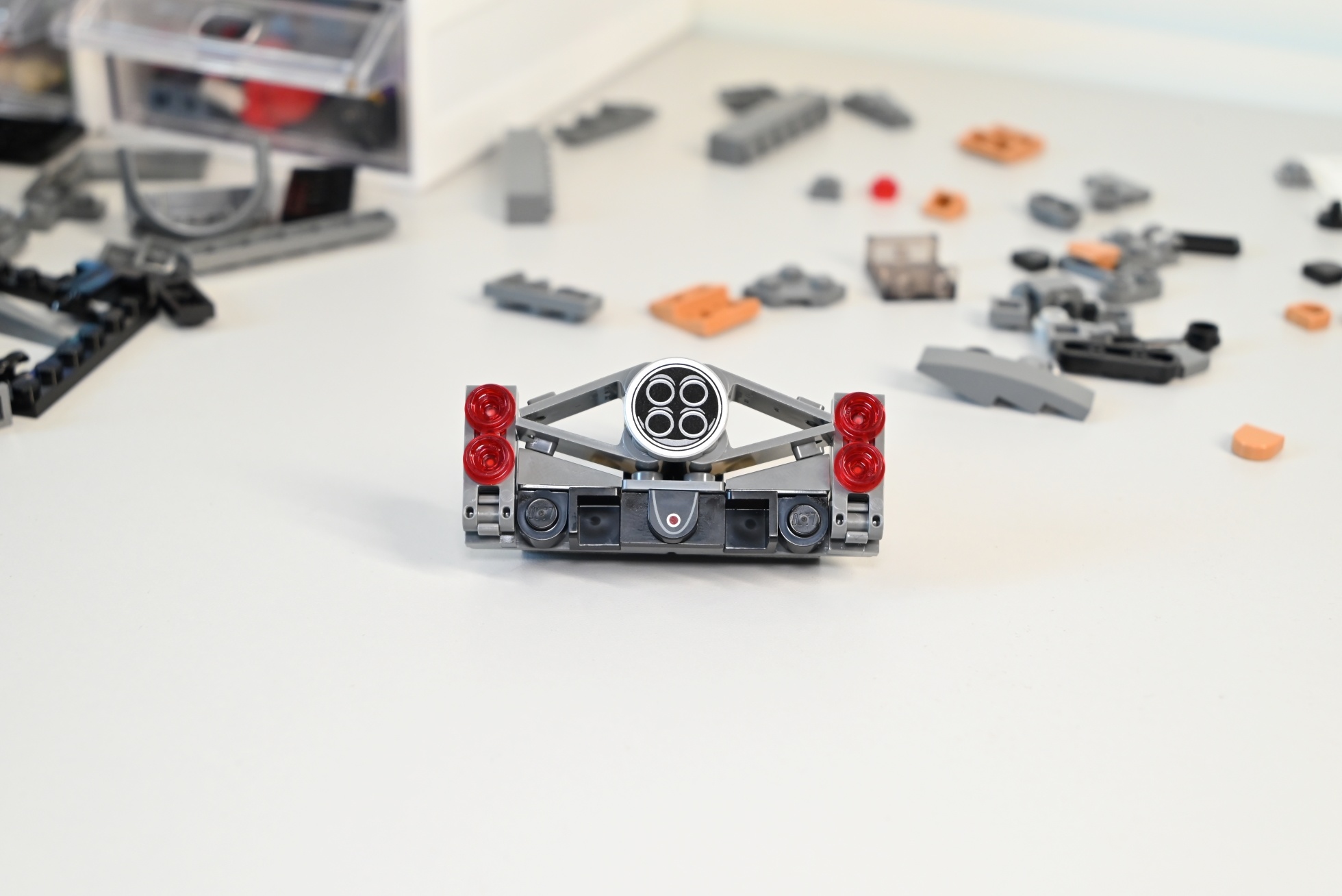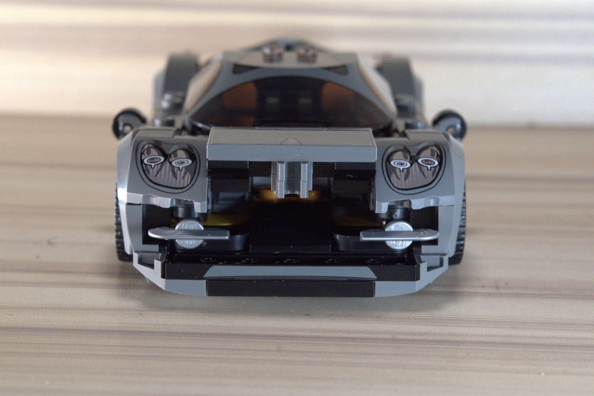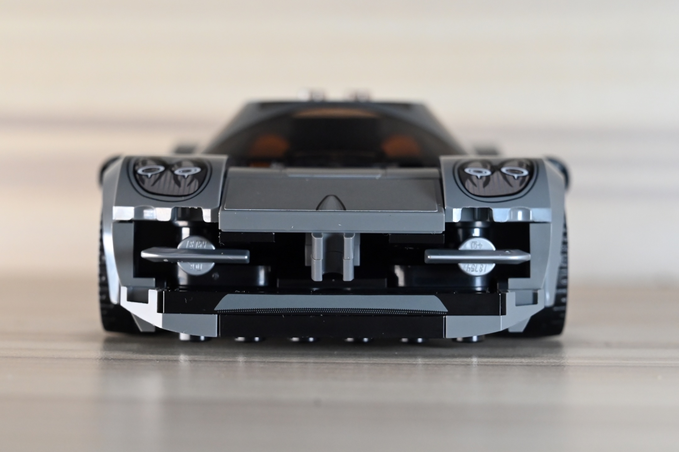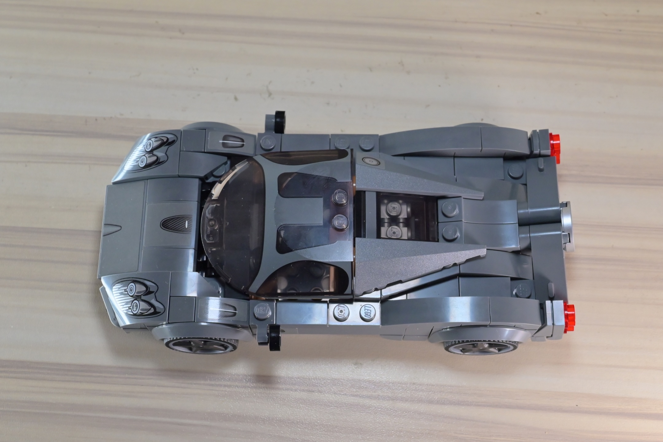 车尾部分是当时最吸引我的地方。使用snot技巧堆叠,用灰色奶酪零件来规范尾翼形状。整个车尾灯是使用连接件和灰色奶酪零件反向拼搭,车尾翼主要有四个门板零件组成,通过一个圆形印刷件来还原帕加尼标志性的四个中央钛合金排气管。