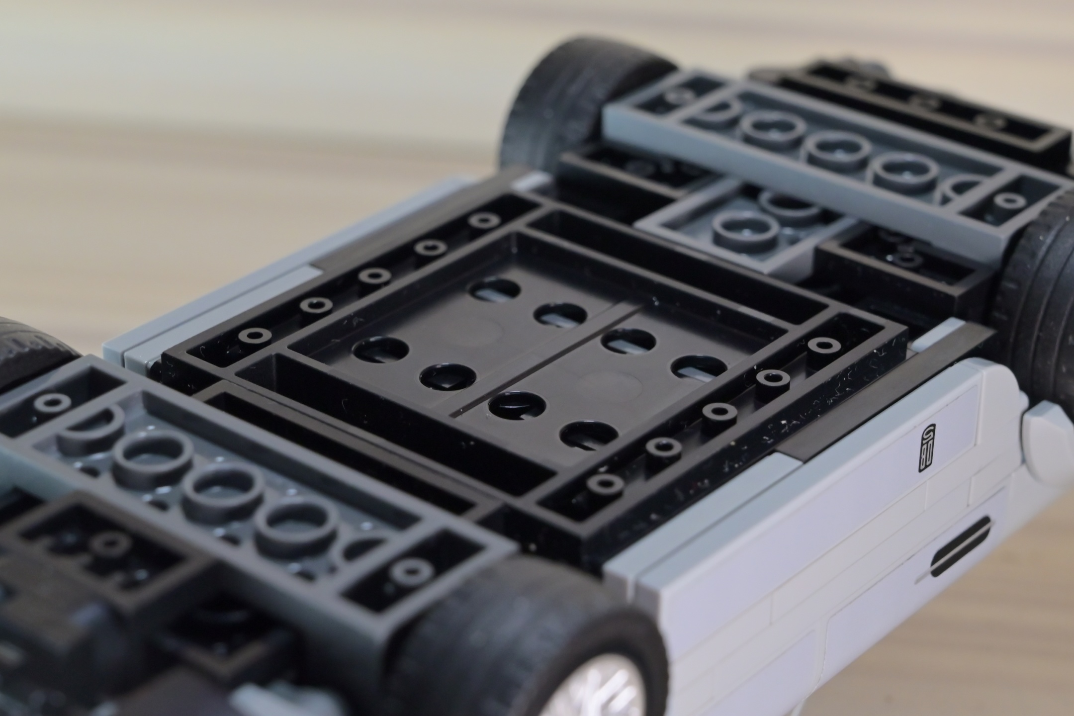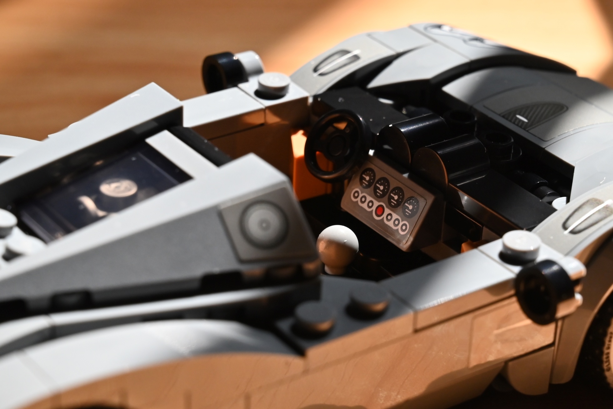 车机部分的还原就有点意思了,使用麦克风零件还原了早期车辆的档把,中控台部分则是使用贴纸来还原。这里乐高出现一个错误,那就是贴纸方向与原车中控不符,需要倒过来贴。