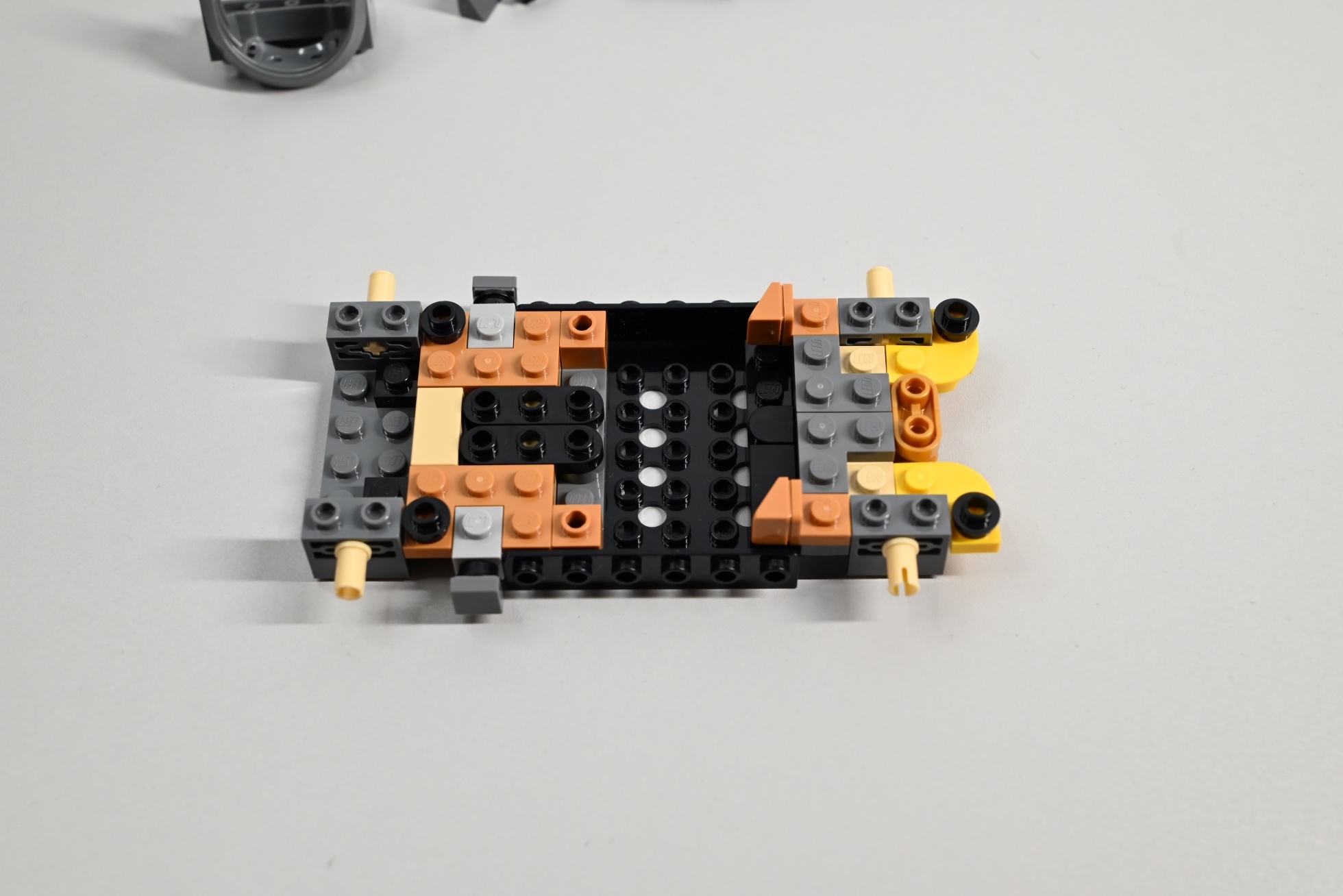 车体悬挂和底盘初步链接,车架部分使用黄色和深橙色零件来丰富色彩和为车体塑形。新版本的八格底座做了一定修改,让他更适合超跑车型。