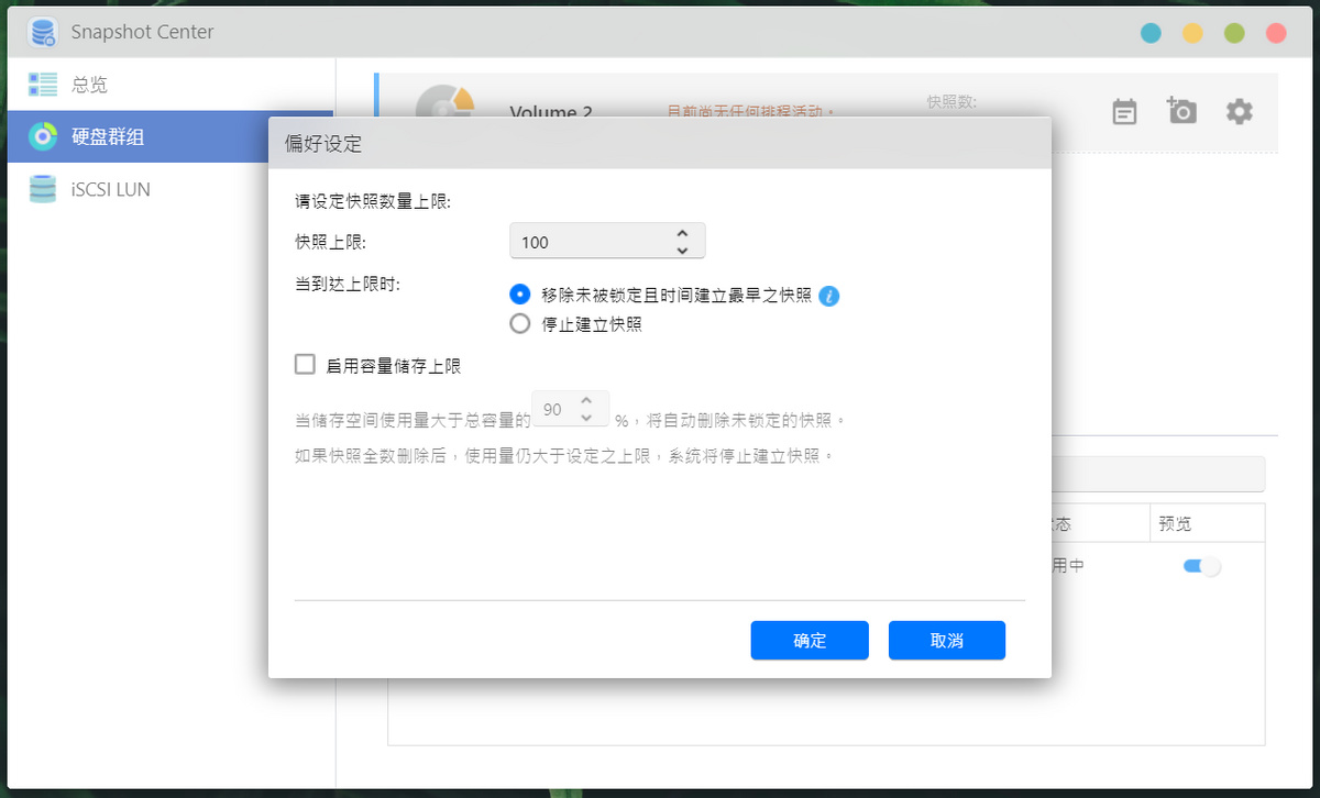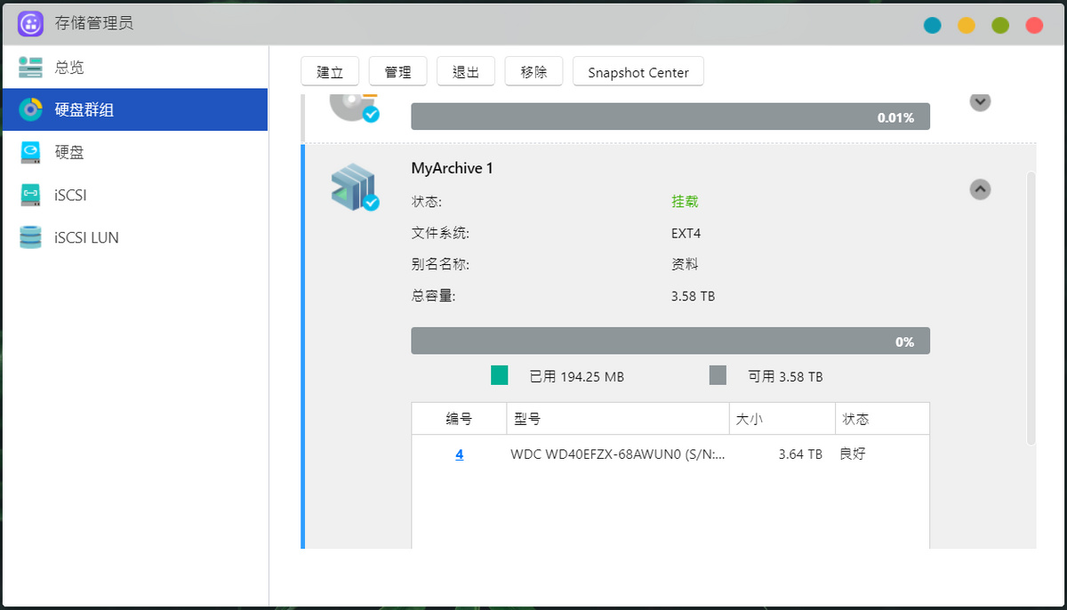 快照功能简而言之就是存档,可以将该硬盘群组的某个时间点进行存档,如果后面使用出现问题,可以将这个硬盘群组快速恢复到存档这个时间点,里面的数据也会保持在存档这一刻的状态。