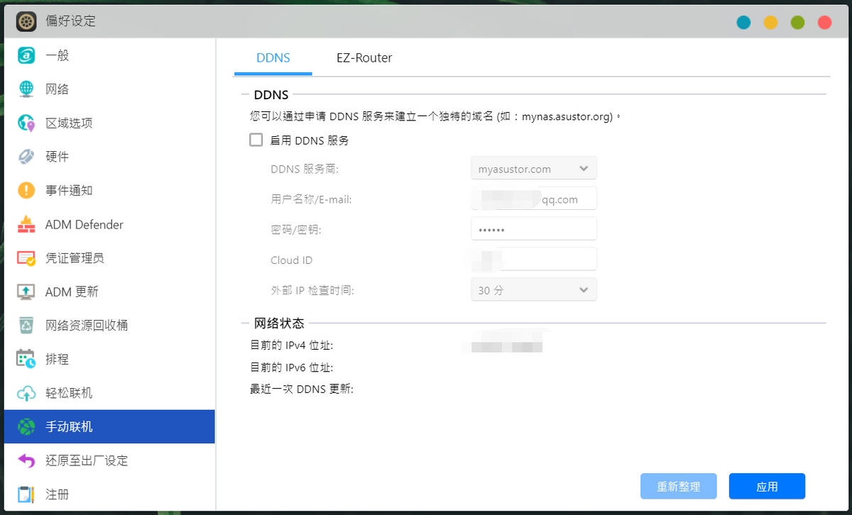 但是动态IP也不用担心,通过DDNS服务咱们可以将其固定到一个域名上,以后通过这个域名访问就可以了,华硕NAS也有诸多DDNS服务提供商,DDNS就是将用户的动态 IP 地址映射到一个固定的域名解析服务上,用户每次连接网络的时候客户端程序就会通过信息传递把该主机的动态 IP 地址传送给位于服务商主机上的服务器程序,服务器程序负责提供 DNS 服务并实现动态域名解析。