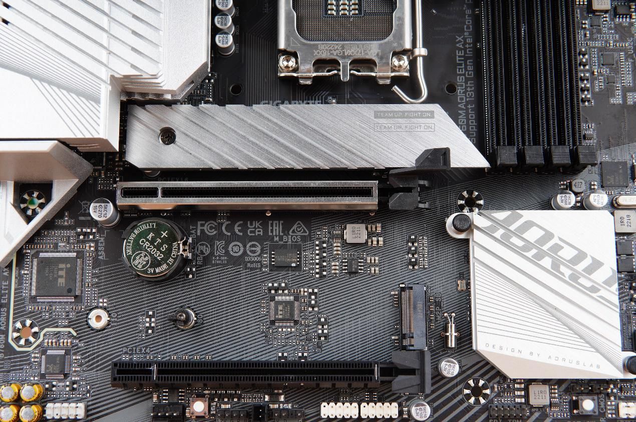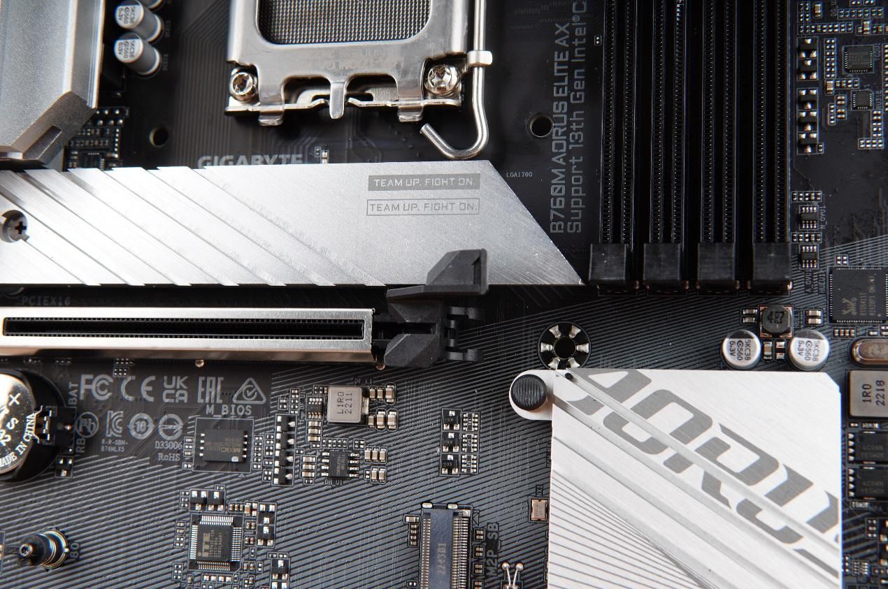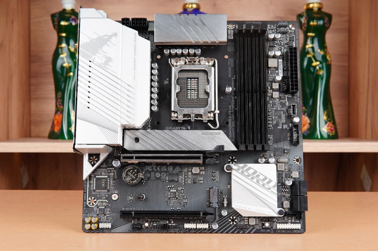 技嘉B760M AORUS ELITE AX的散热马甲全面覆盖了供电、SSD以及芯片组。