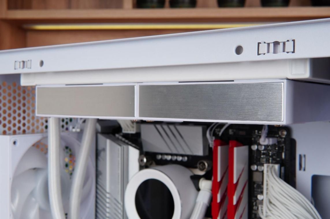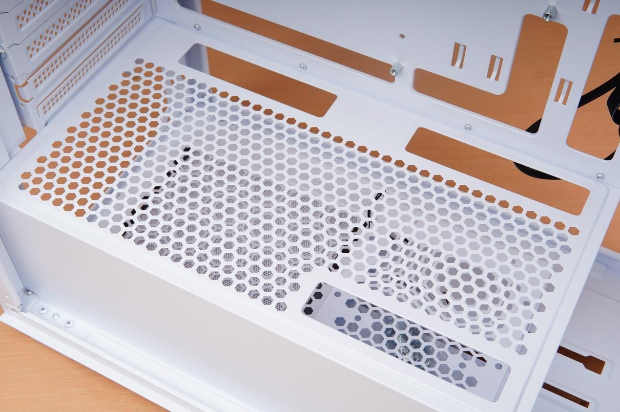 电源仓上盖在靠外侧的位置还额外单独增加了一个显卡电源线走线孔,方便显卡电源线直接从电源仓引上直达显卡的供电口,方便走线的同时还可以营造出更好看的机箱环境。