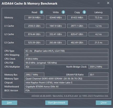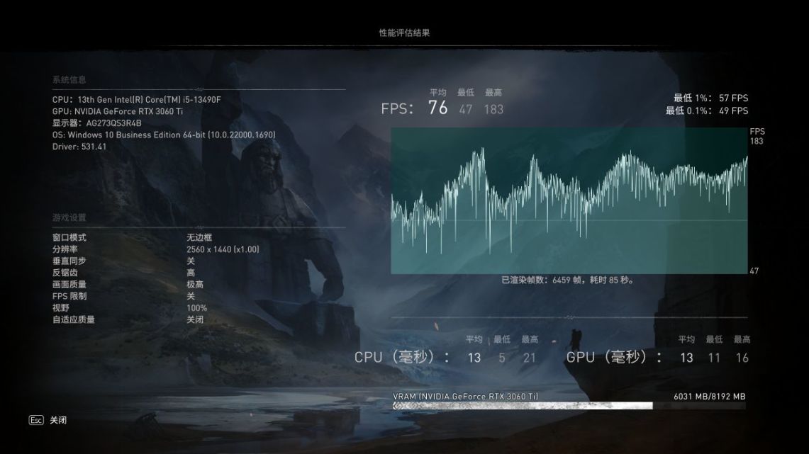得益于七彩虹战斧·赤焰DDR5 6000这套内存的高频率低延迟特性,这套主机的内存性能表现也非常不错,读写速度分别可以达到89138MB/s和83440MB/s,延迟更是只有73.3ns,可以完全发挥i5-13490F的性能了。下面的游戏测试分辨率均在2K下进行。