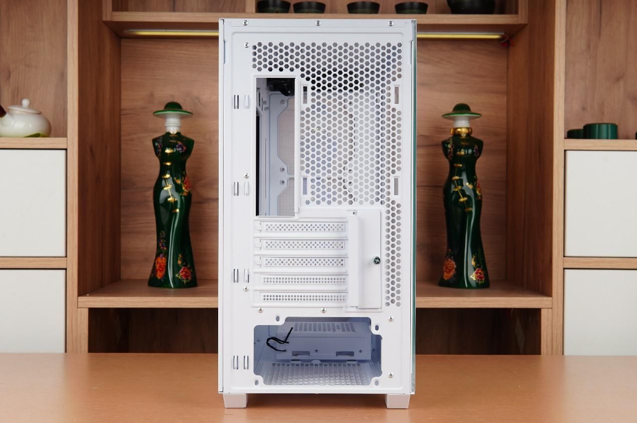 机箱背部为常规的MATX规格,带有一个12CM风扇位以及5条PCIe扩展槽。