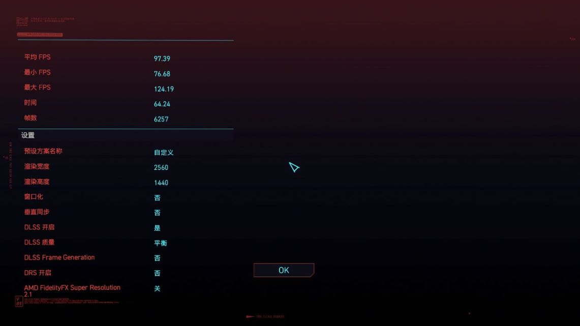 赛博朋克2077,开启预设高画质,开启DSLL平衡后跑出来的平均FPS更是高达97.39FPS,最低也仅为76.68FPS,属于完全流畅可玩。
