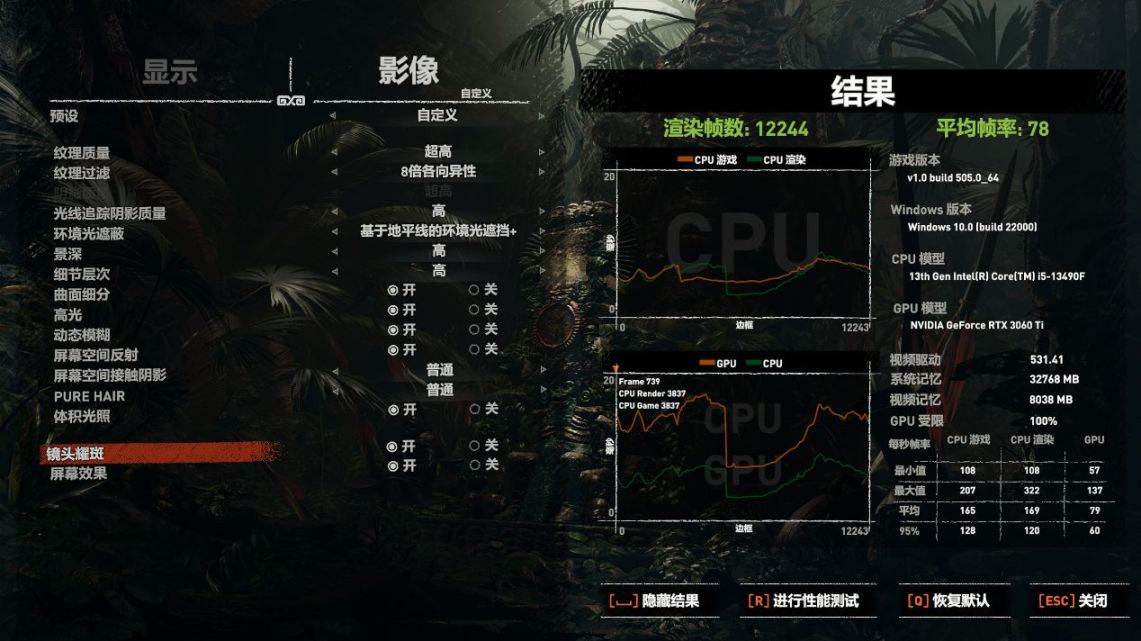 古墓丽影:暗影,开启预设最高画质+高光追+DLSS的情况下平均帧率为78FPS。