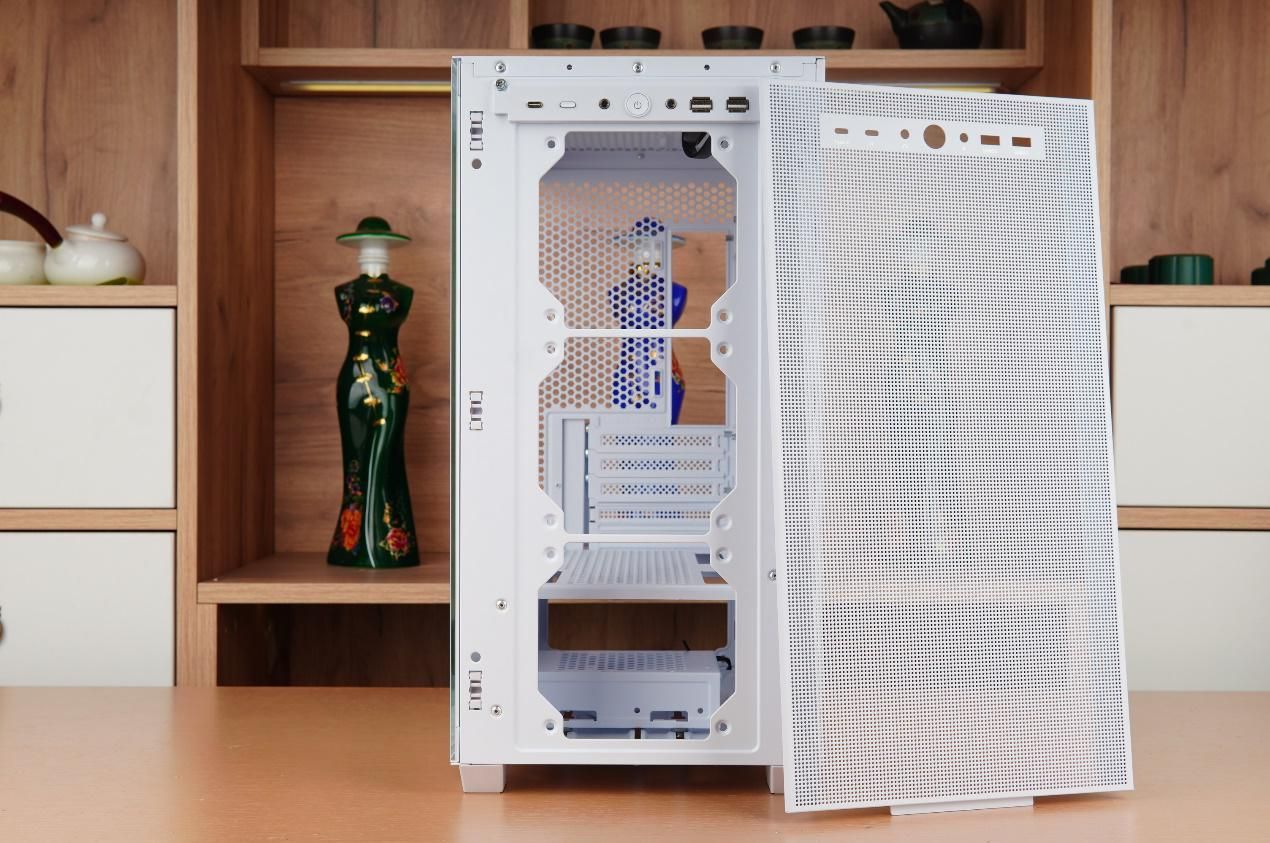 机箱侧面为侧透设计,钢化玻璃面板同样采用了卡扣式设计。