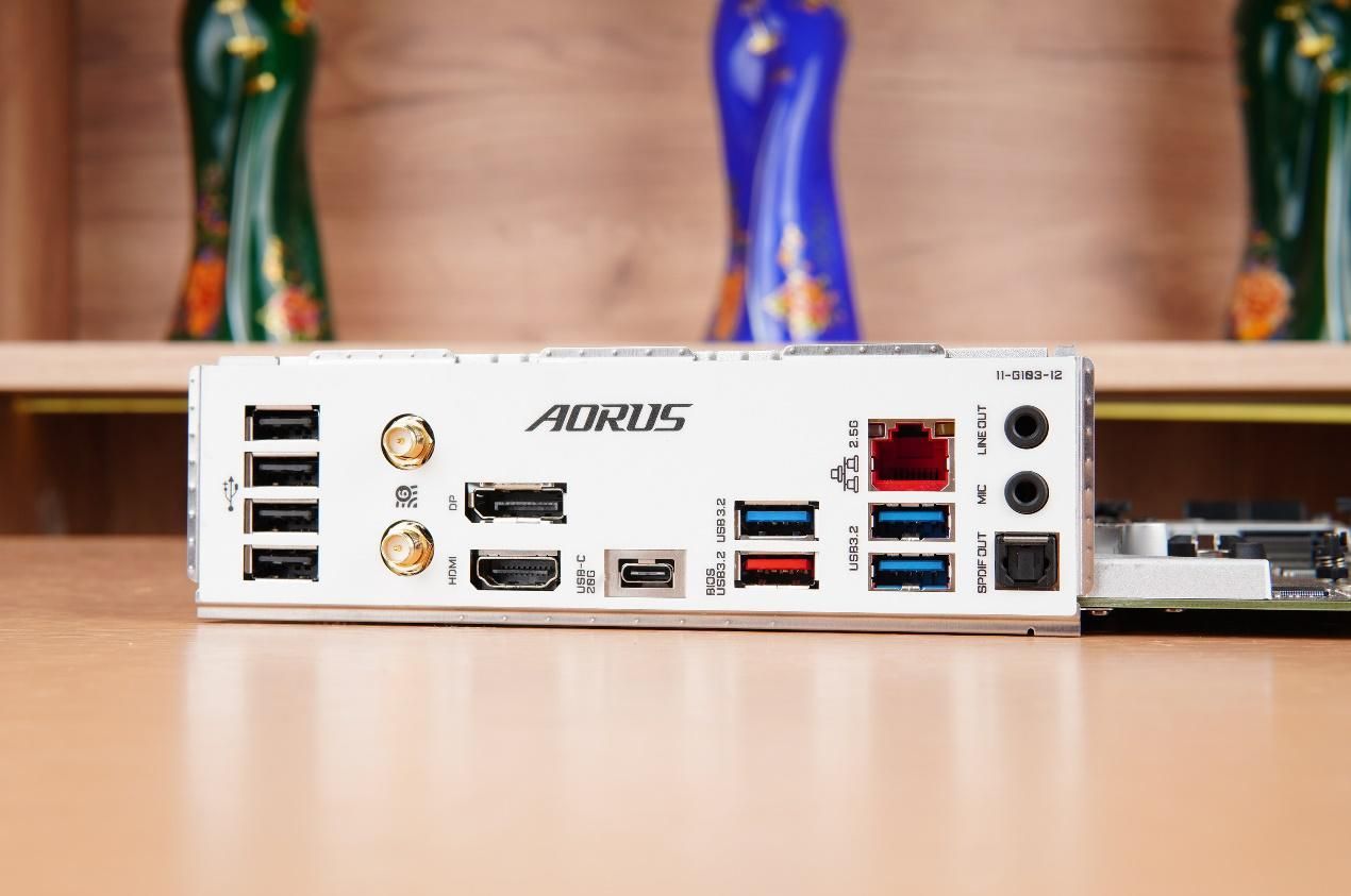 技嘉B760M AORUS ELITE AX还提供了一体式的I/O面板,并配备了丰富的扩展接口,前置提供了10Gbps Type-C接口,而一体式I/O背板上一共提供了9个USB接口,其中包括1个USB Type-C(20Gbps)、4个USB 3.2(Type-A),此外还有DP与HDMI接口供核芯显卡使用。网络部分,则搭载了2.5Gbps有线网卡和Wi-Fi 6E无线网卡。
