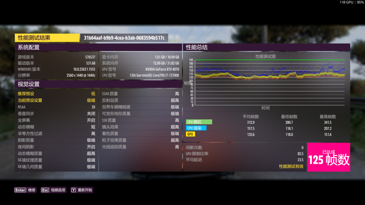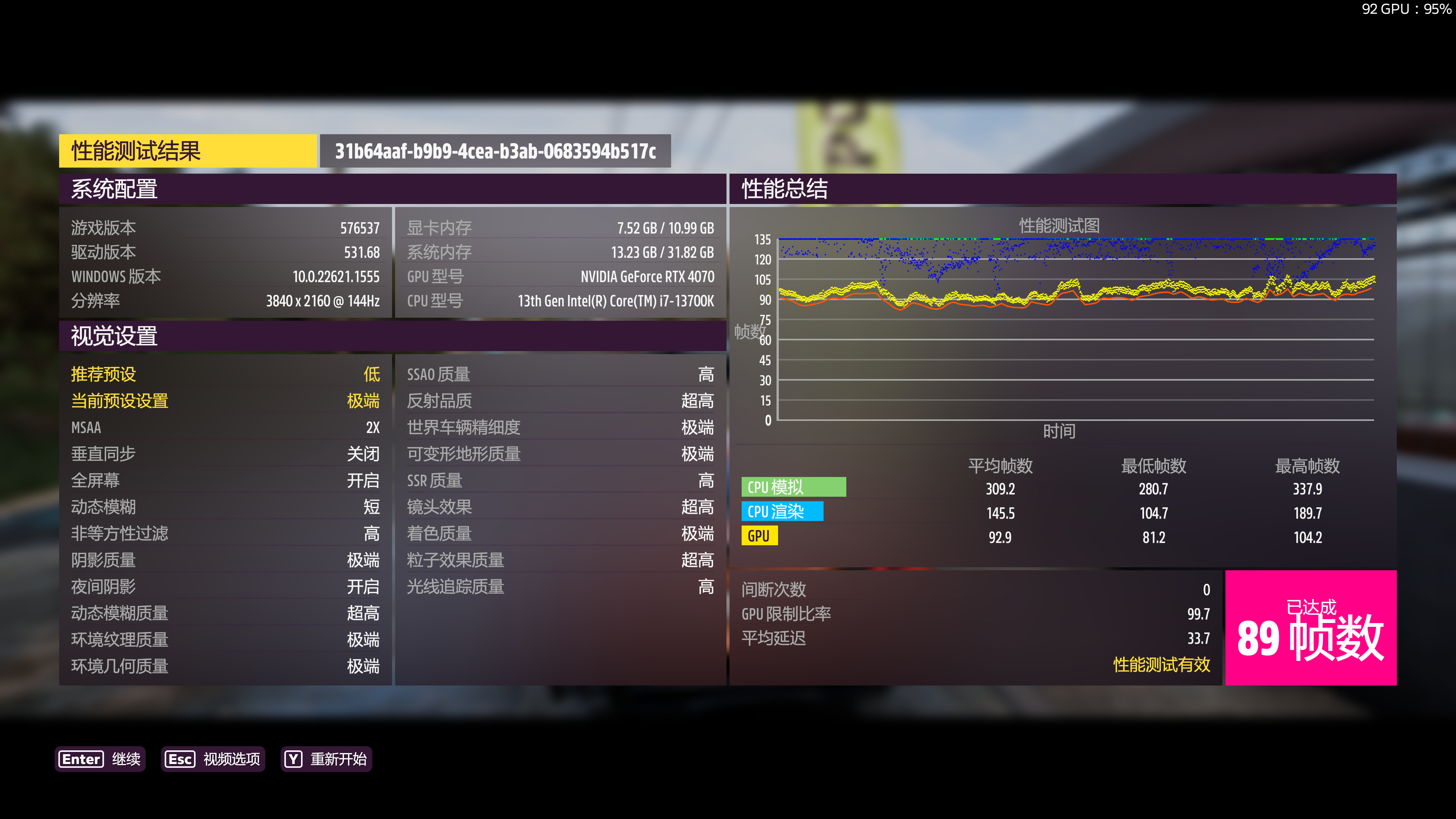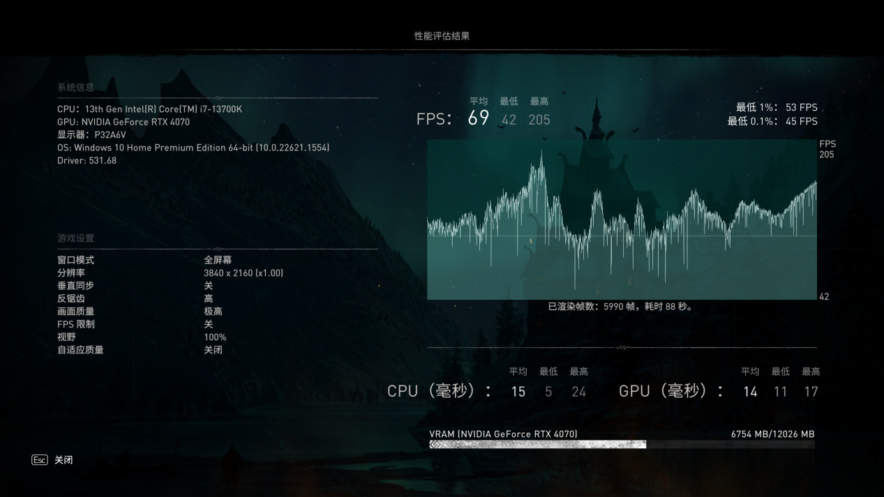 2K分辨率最高画质平均95帧,4K 平均54帧