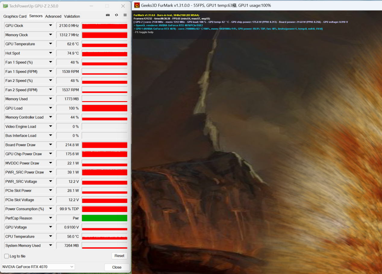 单烤36分钟,显卡功耗215W左右,显卡温度62.6°,这个烤机温度表现还是很OK的。