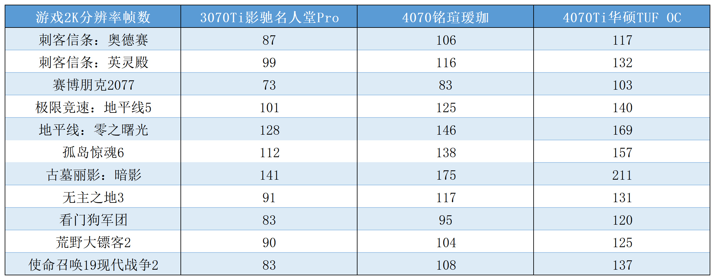 2K分辨率下,4070在测试的大部分游戏中帧数都能过百,性能在2K明显溢出了,比3070Ti强21%左右,比4070Ti弱15%左右。