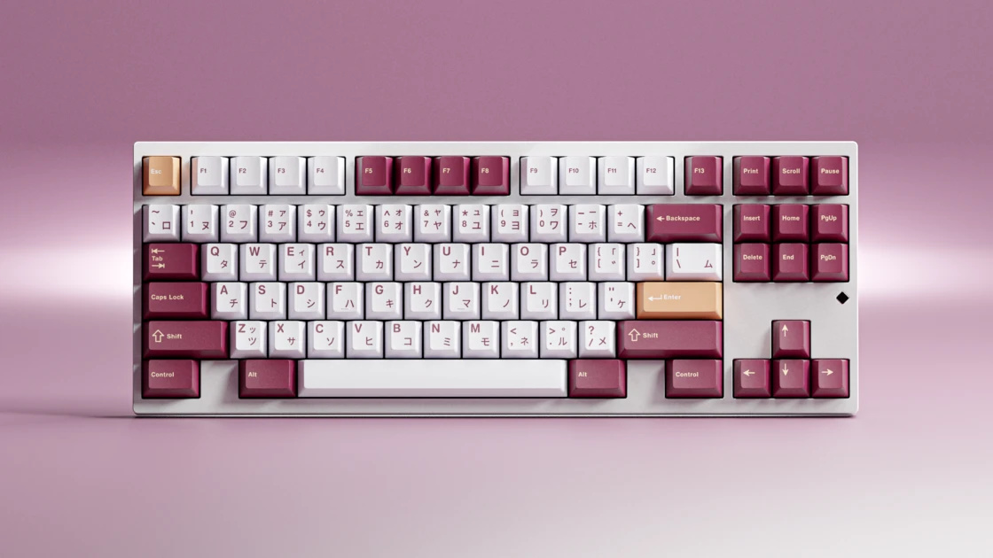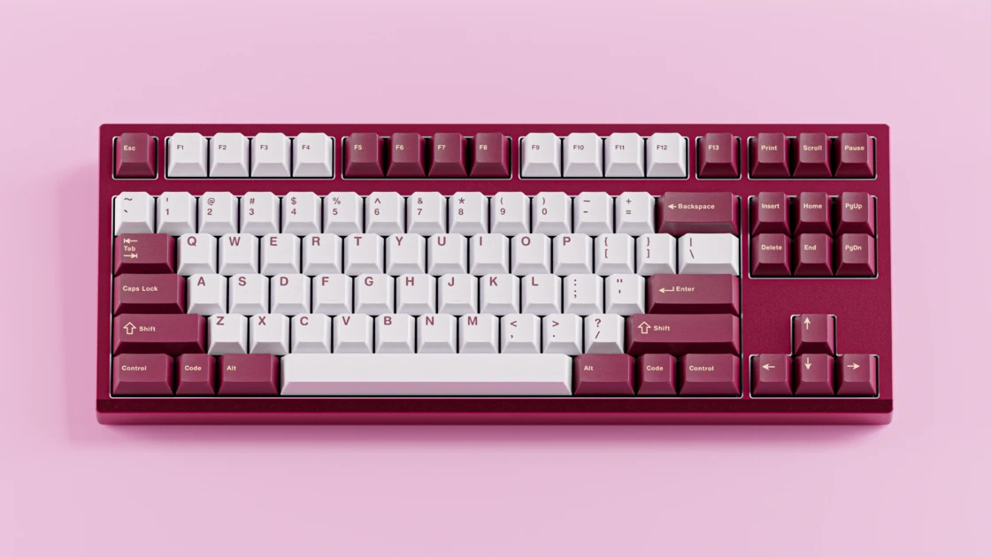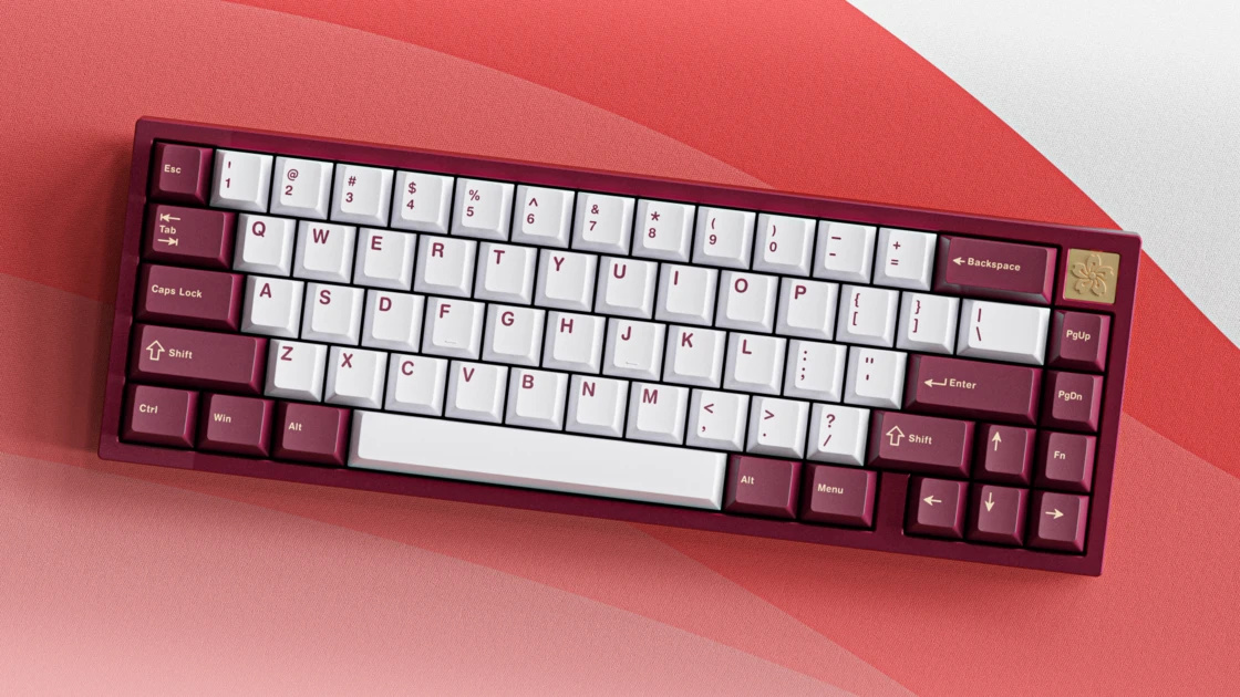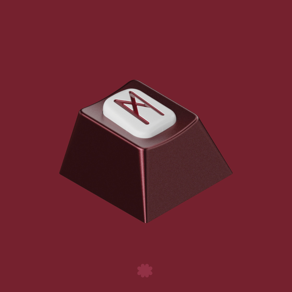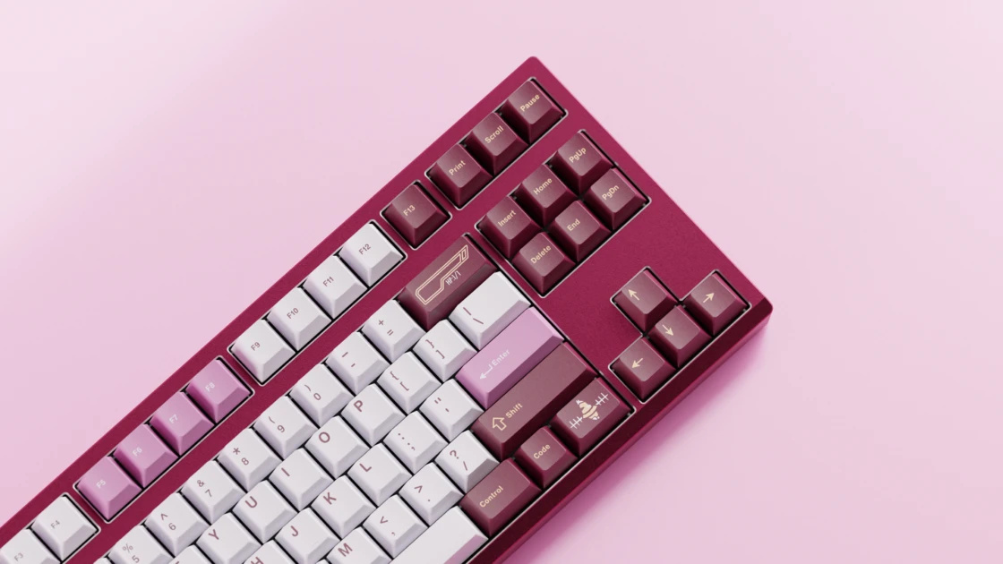 這是一套純色鍵帽,選用了一種具有明顯酒紅色特徵的紅色,可以說是暗紅色、深酒紅色或者棕紅色,這種顏色與血的顏色相比更加深沉、更飽和,有一種神祕感。