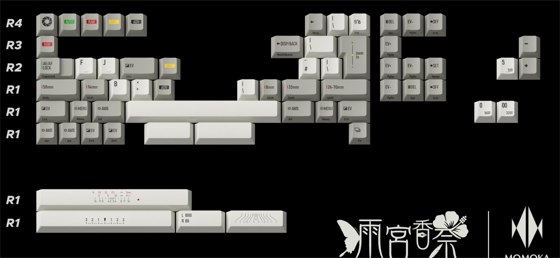 整套鍵帽的功能區和增補鍵的設計邏輯是「鍵盤有着相機的操作性」,將功能鍵字母替換成相機的功能,計算機功能則以側刻的方式呈現。