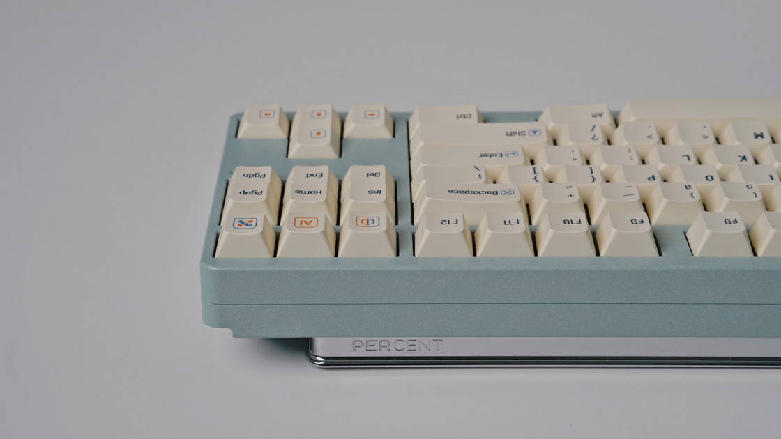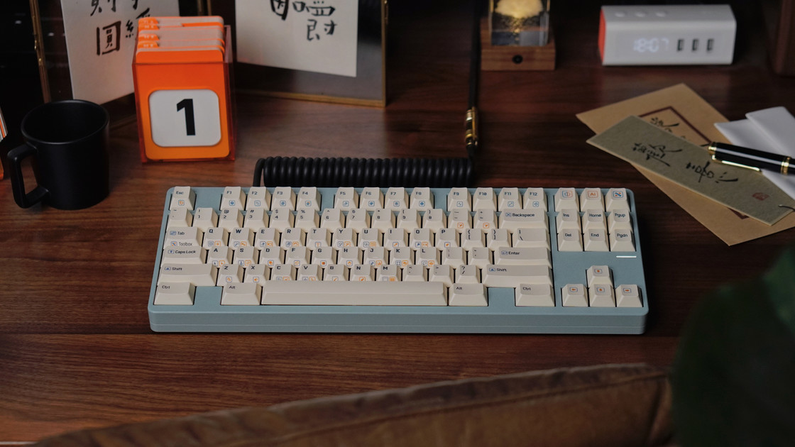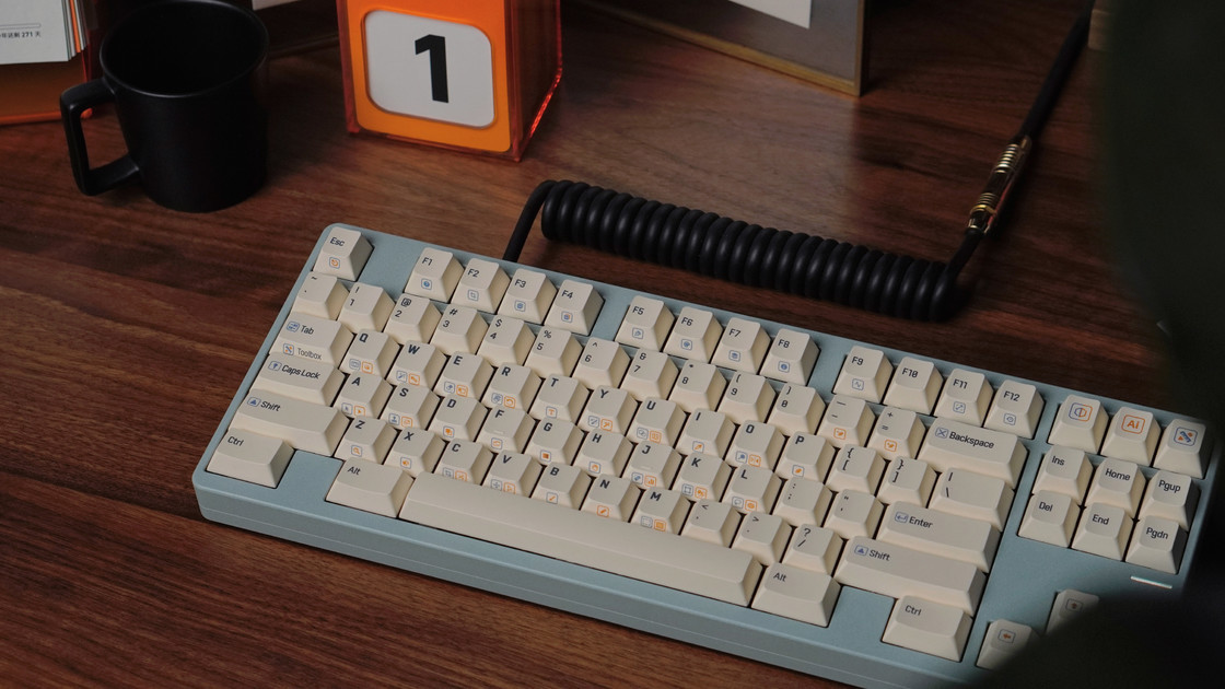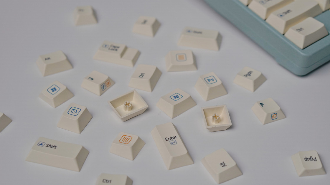 整體搭配給人一種明快、清新、溫和、冷靜的視覺效果,同時,作爲點綴的增補按鍵運用深青色的內斂、深沉與淺黃色的溫和、輕鬆,產生很強的對比,讓整個搭配更加明顯和突出。