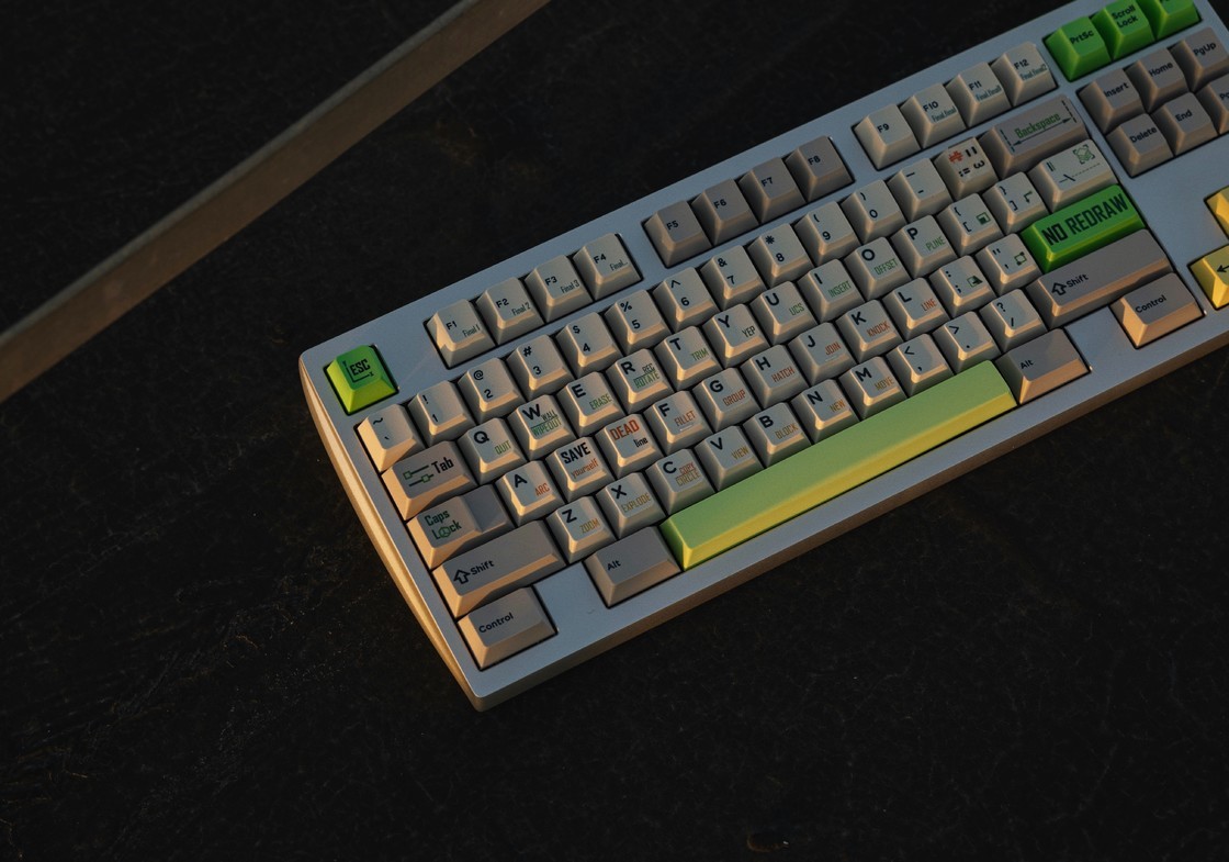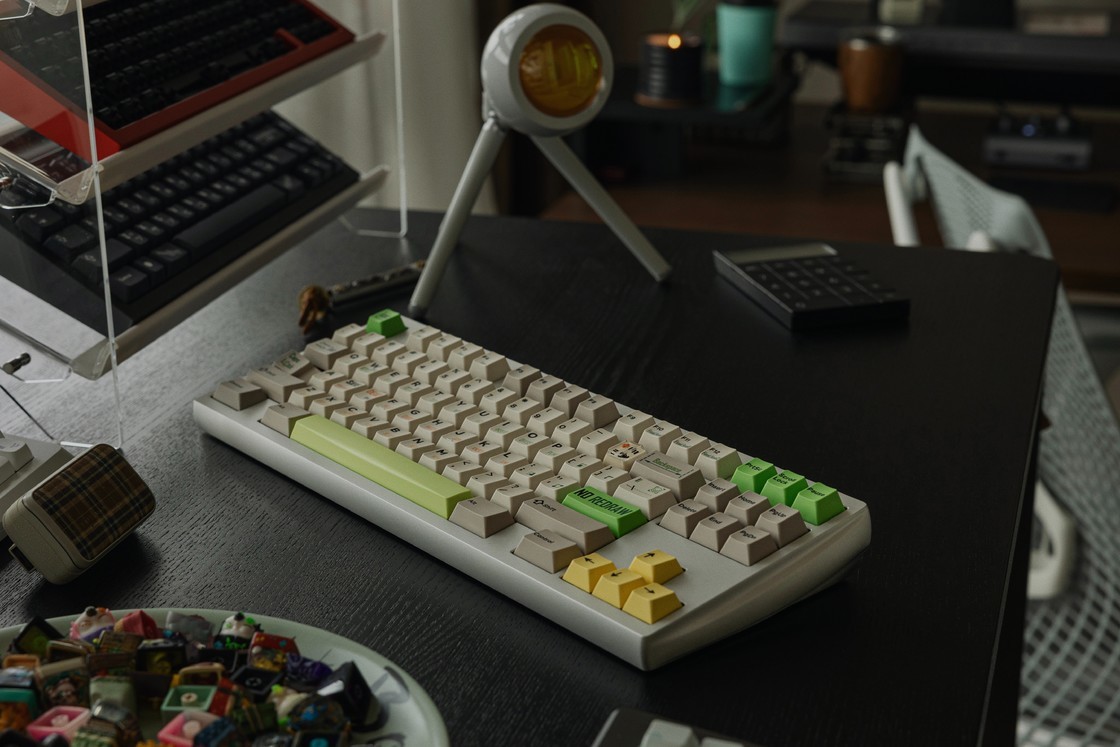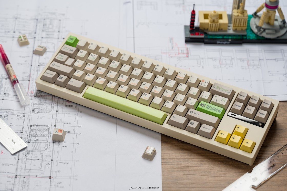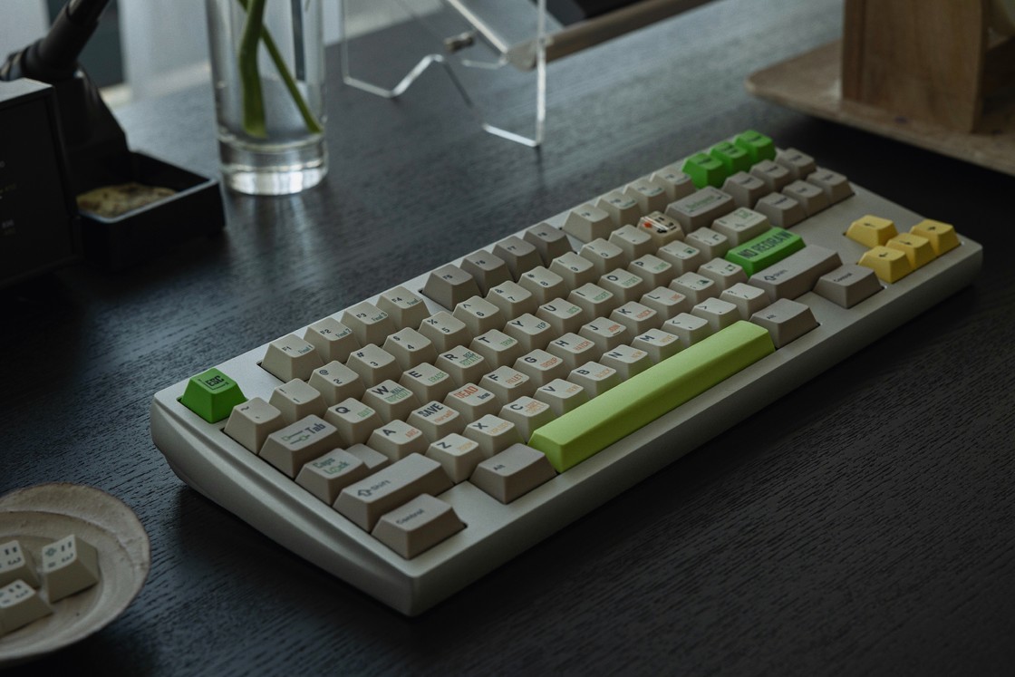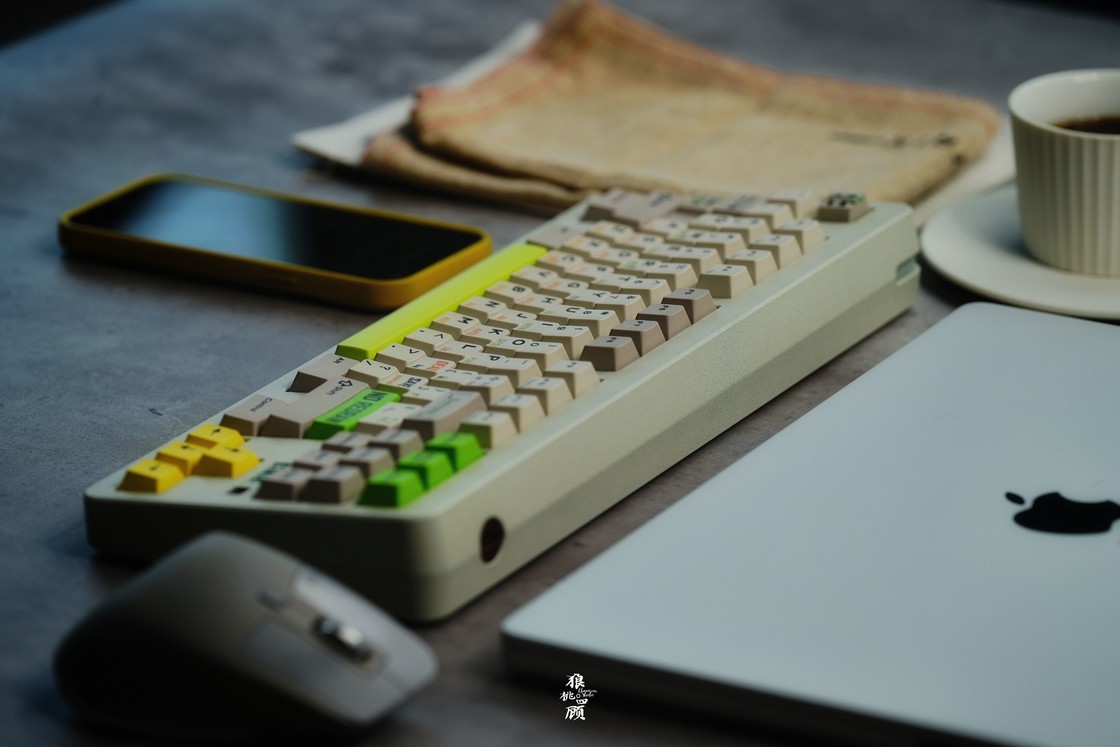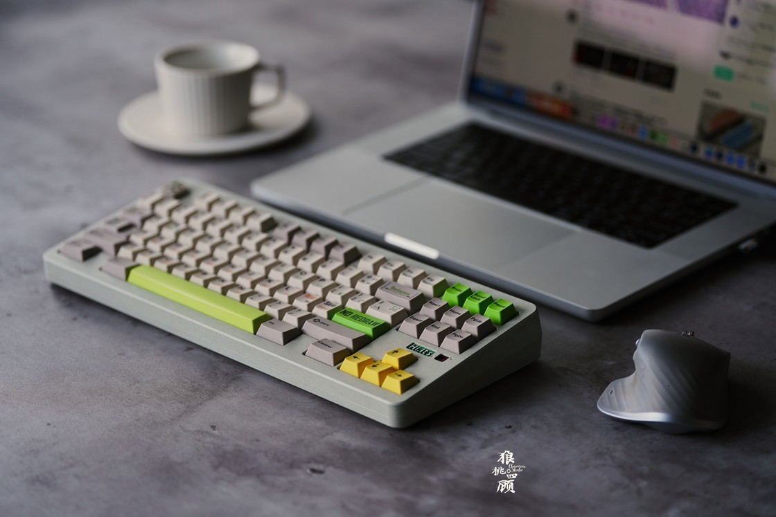 使用淺灰色和淡黃白色作爲鍵帽的基底顏色,搭配黑色字符,並輔以深綠色、淺綠色、淡黃色、明黃色、橙黃色和橙色作爲字根點綴增添明亮感,整體基調看似復古,實則頗具現代風,清新自然,活力四射,同時整體對比強烈,字根效果突出。