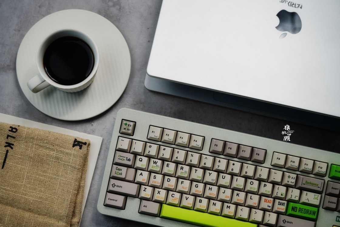復古基調,但不老氣,綠色大鍵的點綴使得整體活力四射,生氣貓貓頭精髓所在,不過有一點還是比較可惜,如果字體部分也能進行主題適配就更好了,沿用DMK的原生字體在這套鍵帽上,還是有點出戲。
