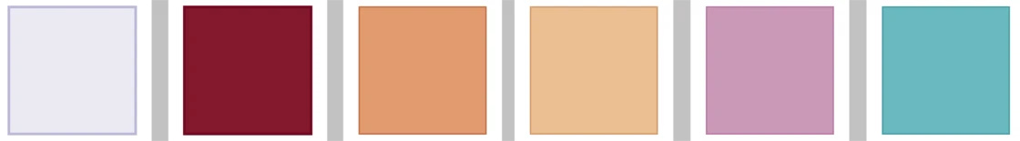 丁香白、甜櫻桃紅、蠟燭黃、金燕麥色、牽牛花粉、水綠。顏色取自角色服飾特徵。紅白基底色算是比較經典的搭配,給人一種柔和、溫暖的視覺體驗,蠟黃色點綴其中也不顯得突兀。
