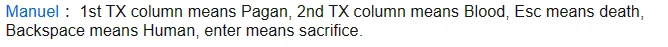 第1 TX列表示異教徒,第2TX列表示血,Esc表示死亡,退格表示人類,回車表示獻祭。
