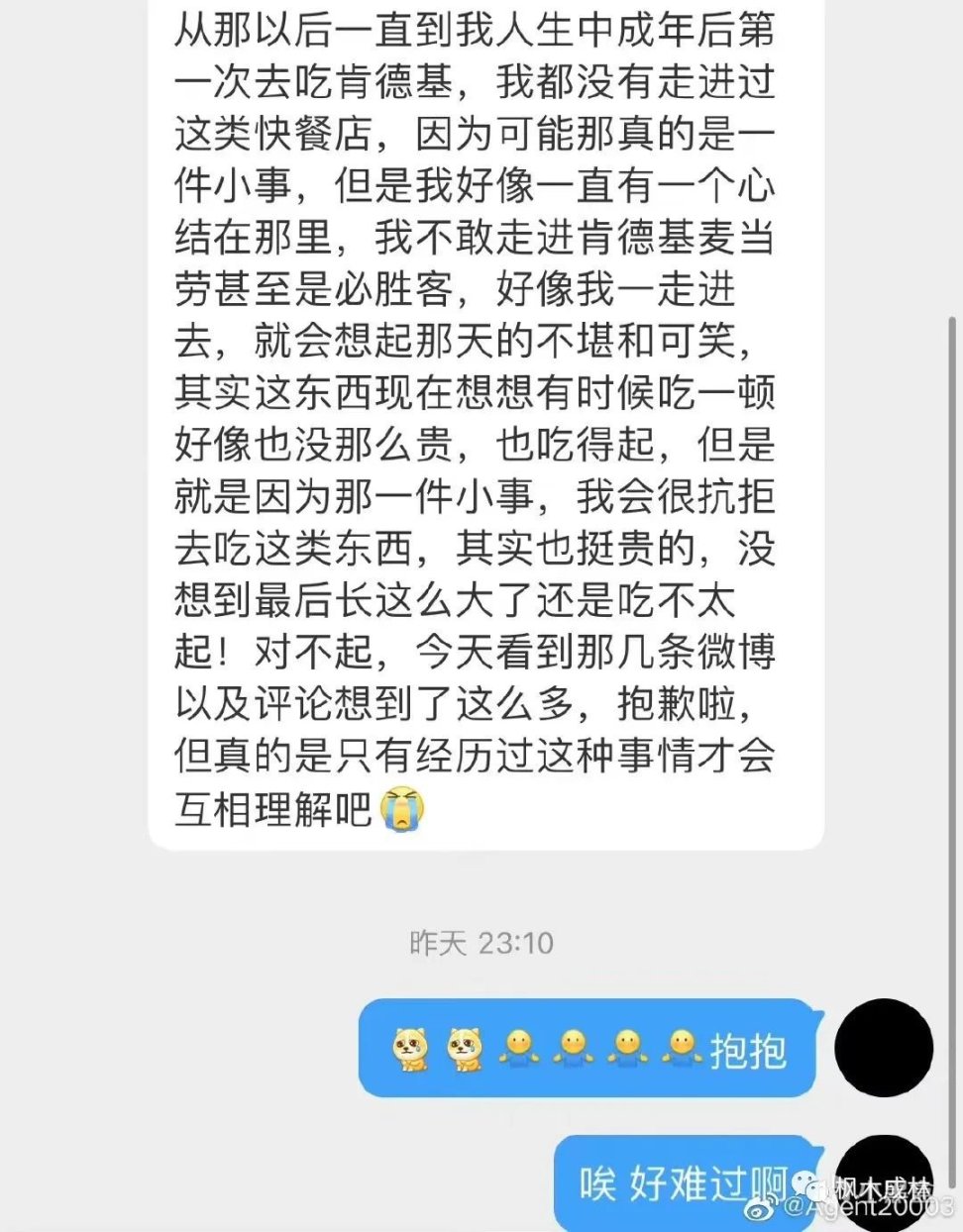 有人给博主发私信,说自己小时候走进肯德基却没有吃上,因为不会点餐;说等到成年后跟同学一起走进麦当劳时还要装出一副常常来吃的模样。