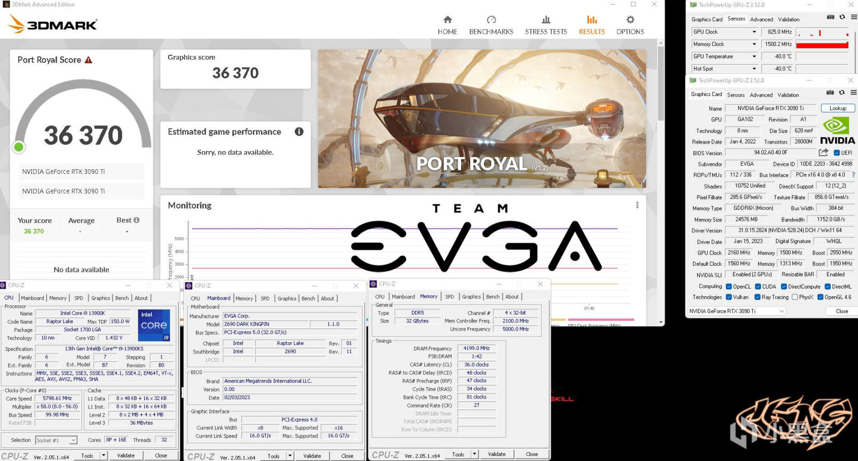 衆所周知,取得3DMark世界紀錄並不容易,所以此時突破世界記錄,散熱的功勞必不可少,這兩個EVGA RTX 3090 Ti都採用液氮罐散熱,顯卡主頻超頻至2550MHz,頻率比默頻高31%,比公版3090Ti高37%,睿頻則達到了2715MHz