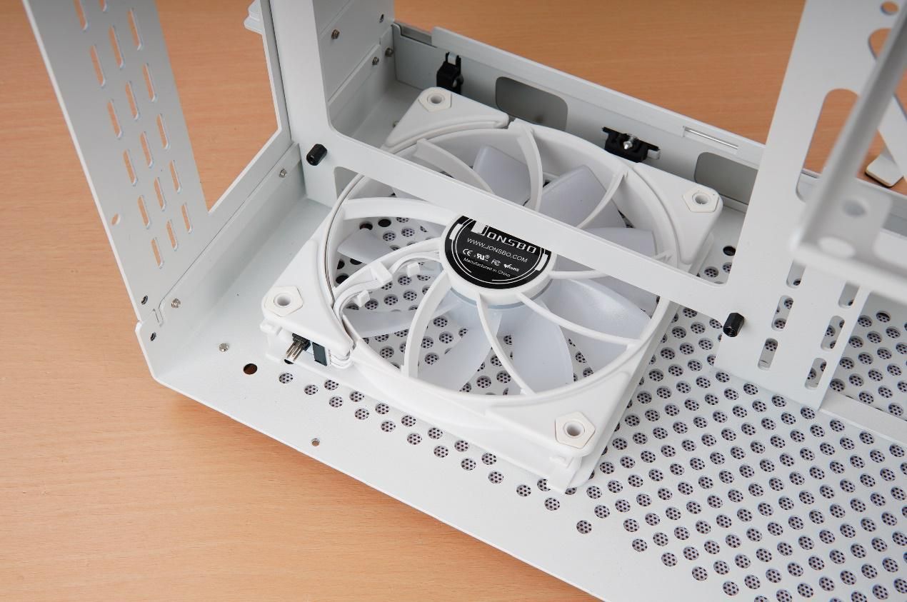 机箱顶部设有2个12025的风扇位,兼容240规格水冷的安装。
