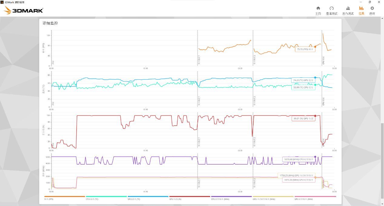 同时利用3DMARK跑分来模拟游戏运行负载,可以看到此时的CPU温度表现则依然不错,全程仅在60°C左右徘徊,最高温度也仅为80°C左右;GPU表现则基本全程维持在70-80°C以内,表现也不错。