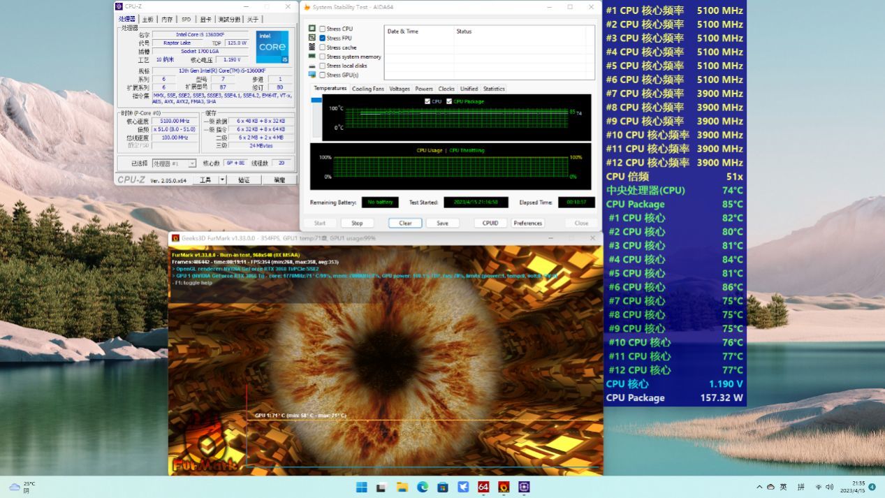 在持续双烤10分钟后Intel酷睿i5-13600KF温度保持在74°C,核心温度稳定在85°C,P核保持5.1Ghz,E核保持在3.9GHz,全程没有降频的出现,总体看CPU温度表现不错,目前也算是一个比较甜点的温度区间了;GPU的温度则维持在了71°C,表现非常出色。可以看到闪鳞S500的散热表现还是相当不错的,得益于一体式水冷的加持,可以有效应对功耗更高的CPU散热需求了,ITX主机的CPU也不在局限于入门级的i3或者i5了,更高级别的i5型号乃至i7也是可以的。