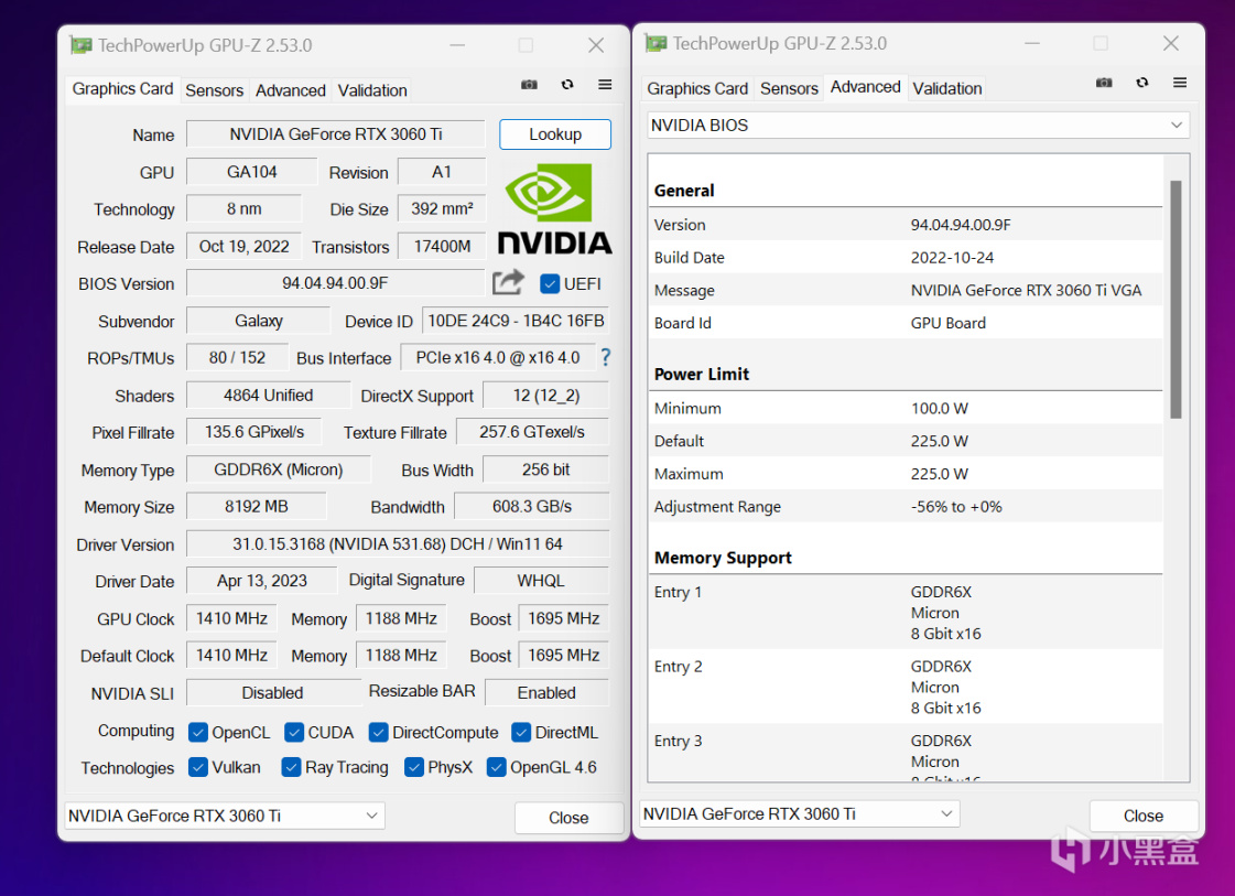 GPU-Z参数一览,RTX 3060 Ti GD6X金属大师属于OC版本,Boost频率可以达到1695MHz,相比NVIDIA官方设定要高一些,同时采用GDDR6X显存的特性,使之性能更接近RTX 3070,不过金属大师定位是主流级,功耗墙设定最大就只有225W,这种设定根据个人经验来看是没有太大的超频空间了,全程测试会开启Resizable BAR技术为显卡提升一些性能。