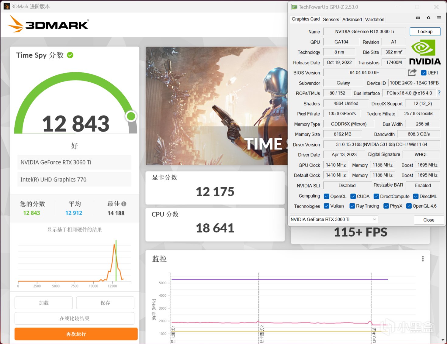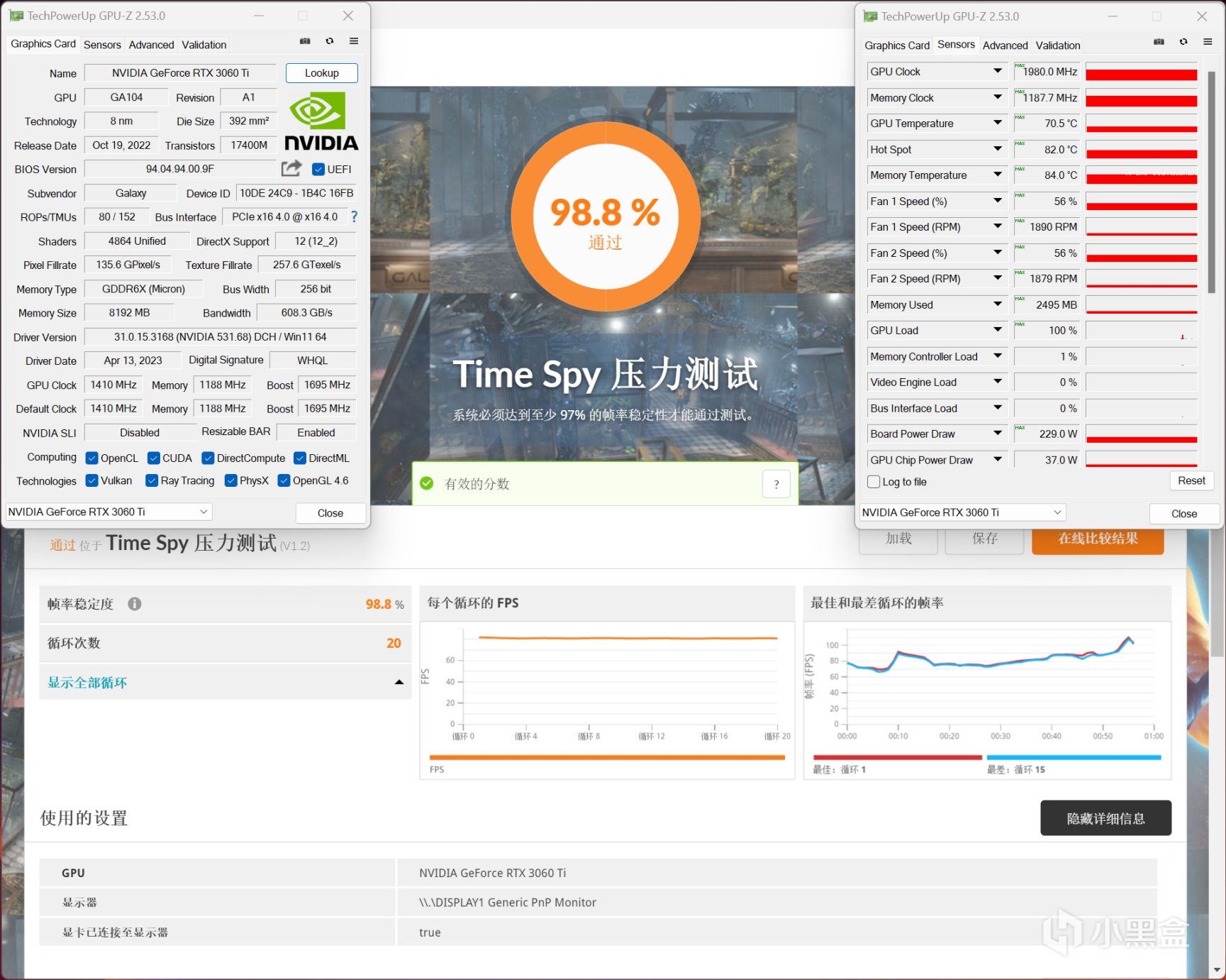 散热性能方面,使用3DMark Time Spy压力测试来验证一下(2K分辨率,并且强度和游戏相似),最终影驰RTX 3060 Ti GDDR6X 金属大师OC通过率达到了98.8%,最高核心频率达到1980MHz,(室温25℃封箱状态)GPU核心温度最高是70.5℃,显存温度是84℃,风扇转速最高只有1890RPM,整体散热和噪声表现均衡,没有偏向任何一方面。