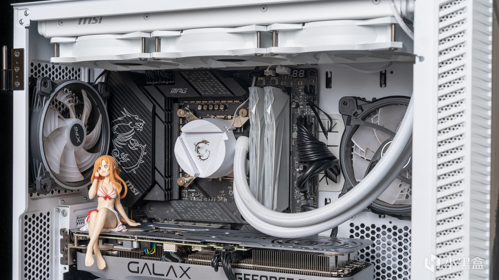 测试搭配的CPU是Core i7-13700K,CPU散热器自然是360 AIO水冷跑不了,使用的是微星寒冰360R V2白色版本,冷头采用手动自由旋转的龙纹LOGO设计,和冷排风扇一样是支持ARGB灯效,除此之外这款水冷水泵位于冷排上,可最大程度降低噪声。