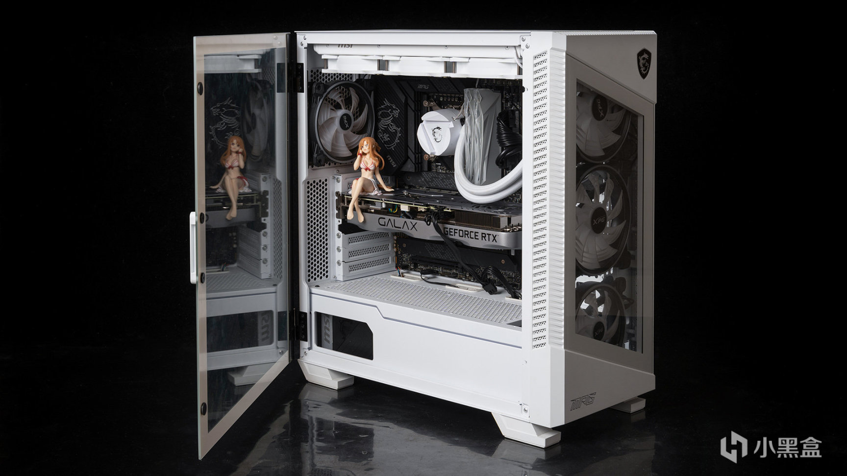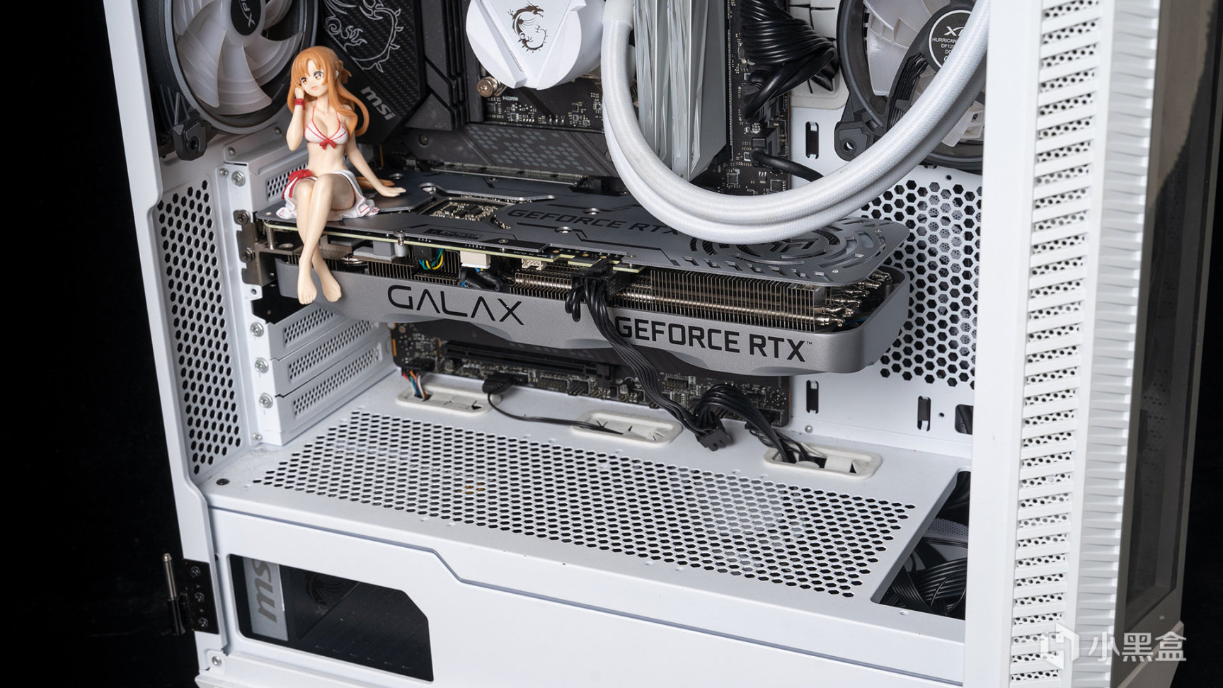 本文还要对显卡进行散热测试,自然是封箱进行,机箱使用微星这款MPG VELOX 刀锋100R白色版本,前置I/O丰富有扩展功能按钮(Clear CMOS或者灯光控制)、USB Type-C接口等卖点,外观采用主流的侧透海景房设计,前置预装了2*140mm+1*120mm ARGB风扇,机箱内侧和后置各安装1*120mm ARGB风扇,顶部还有360水冷实现排风效果。