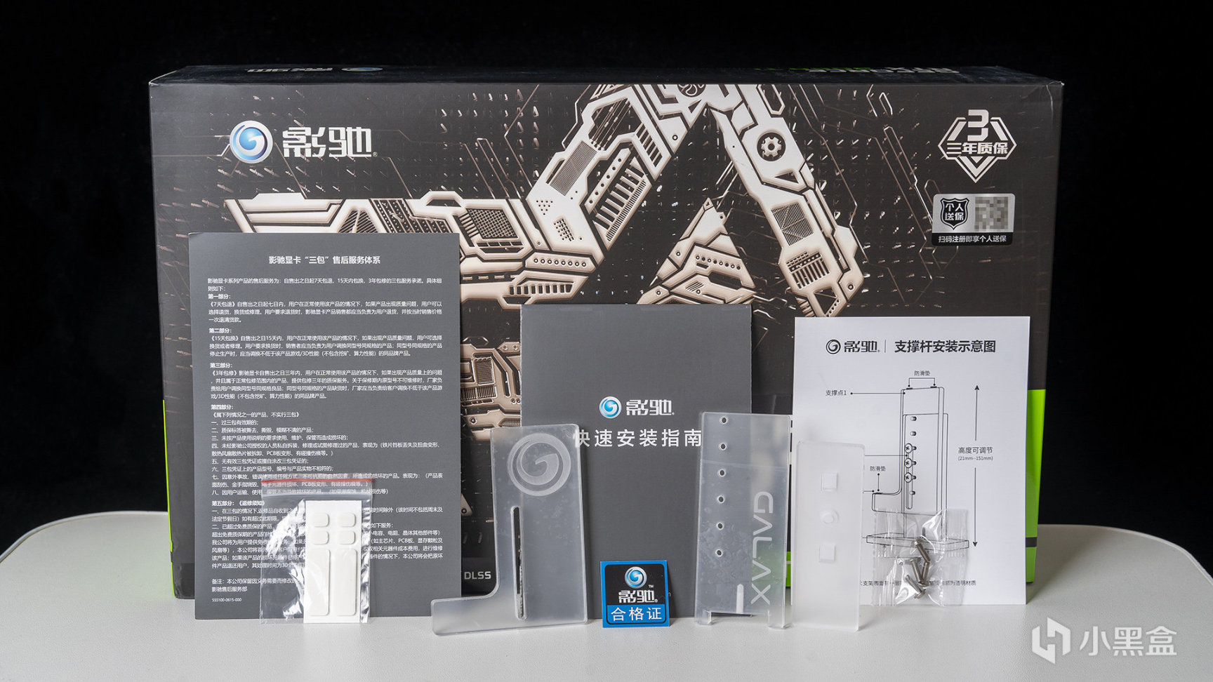 配件一览,包括各种纸质说明、质保卡以及官配显卡支撑杆,这款支架是半透明亚克力材质设计的,部件可分离(通过螺丝固定住),对于三风扇规格的非公确实是刚需配件,起码视觉效果看起来不会是歪的。