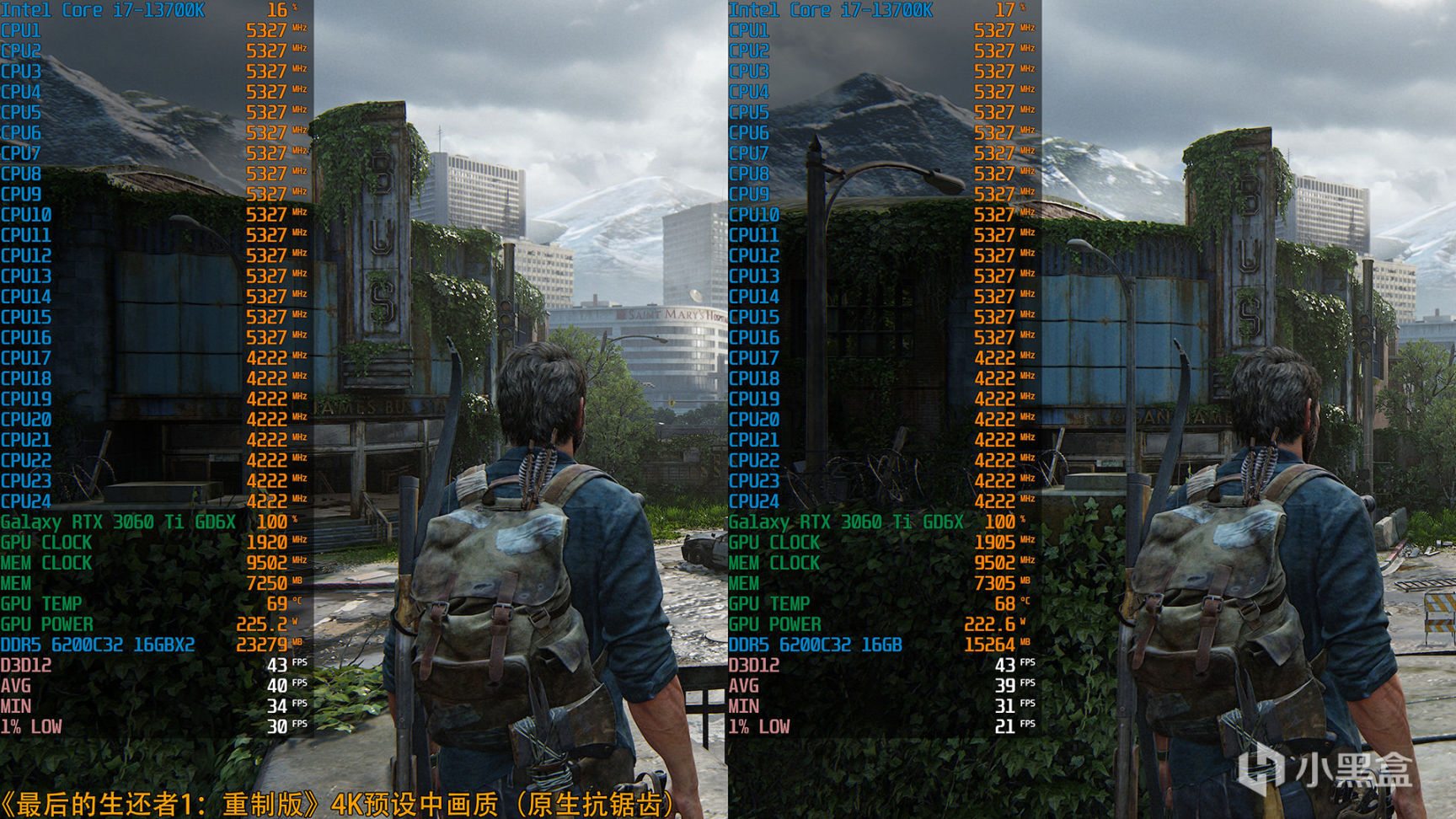 《最后的生还者1:重制版》4K预设中画质(原生抗锯齿),32GB和16GB内存硬件OSD信息一览
